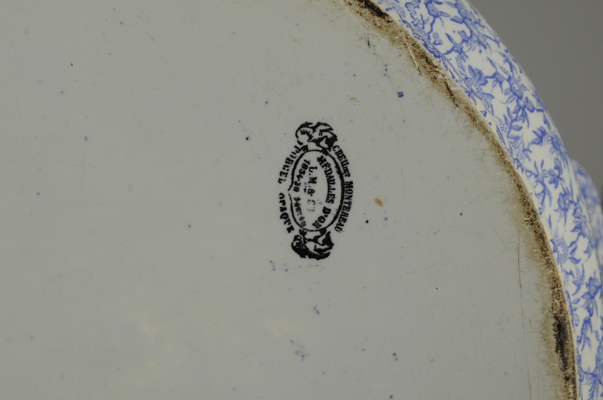 CREIL et MONTEREAU. JARDINIÈRE en faïence fine. Décor camaïeu bleu de semis de fleurettes. Marque au tampon au revers. Fin XIXème. Haut. 19, Larg. 44, Prof. 26 cm.