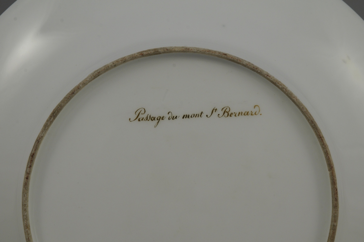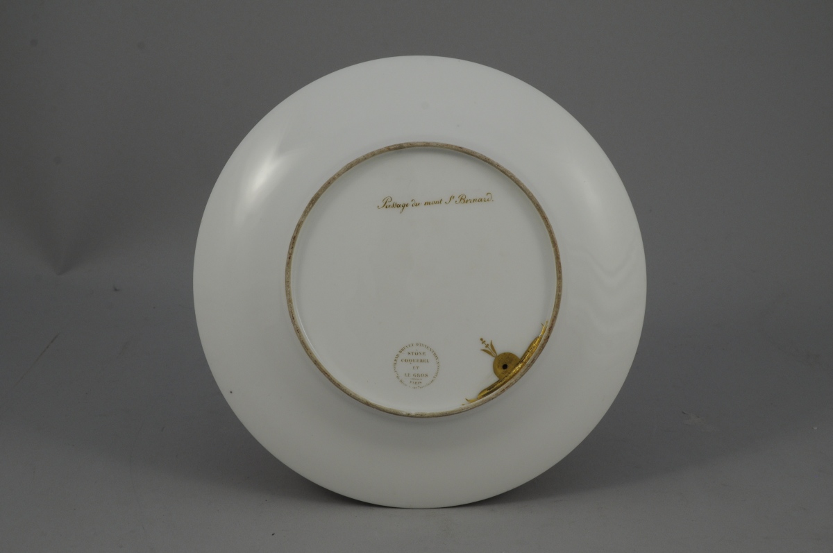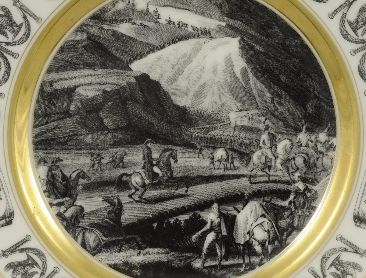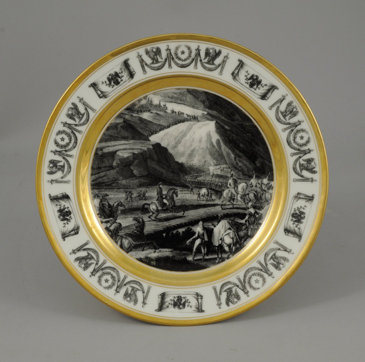 CREIL. LE COL DU MONT SAINT-BERNARD. ASSIETTE en faïence fine. Décor imprimé noir représentant NAPOLÉON et ses troupes PASSANT LE COL DU MONT SAINT-BERNARD. Frise alternée de glaives, guirlandes feuillagées, aigles, couronnes de laurier, étoiles et étendards à l'aigle branché. Filets or sur le marli et le bord. Titrée au revers et marquée au tampon à l'or "Passage du mont St Bernard", "STONE, COQUEREL ET LEGROS / PARIS / Par brevet d'invention / manufre de déco sur Porcelaine, Faïence".