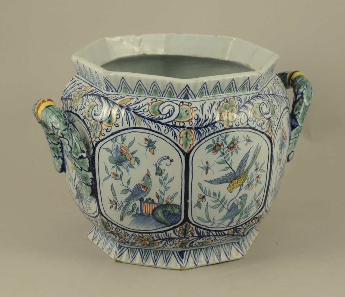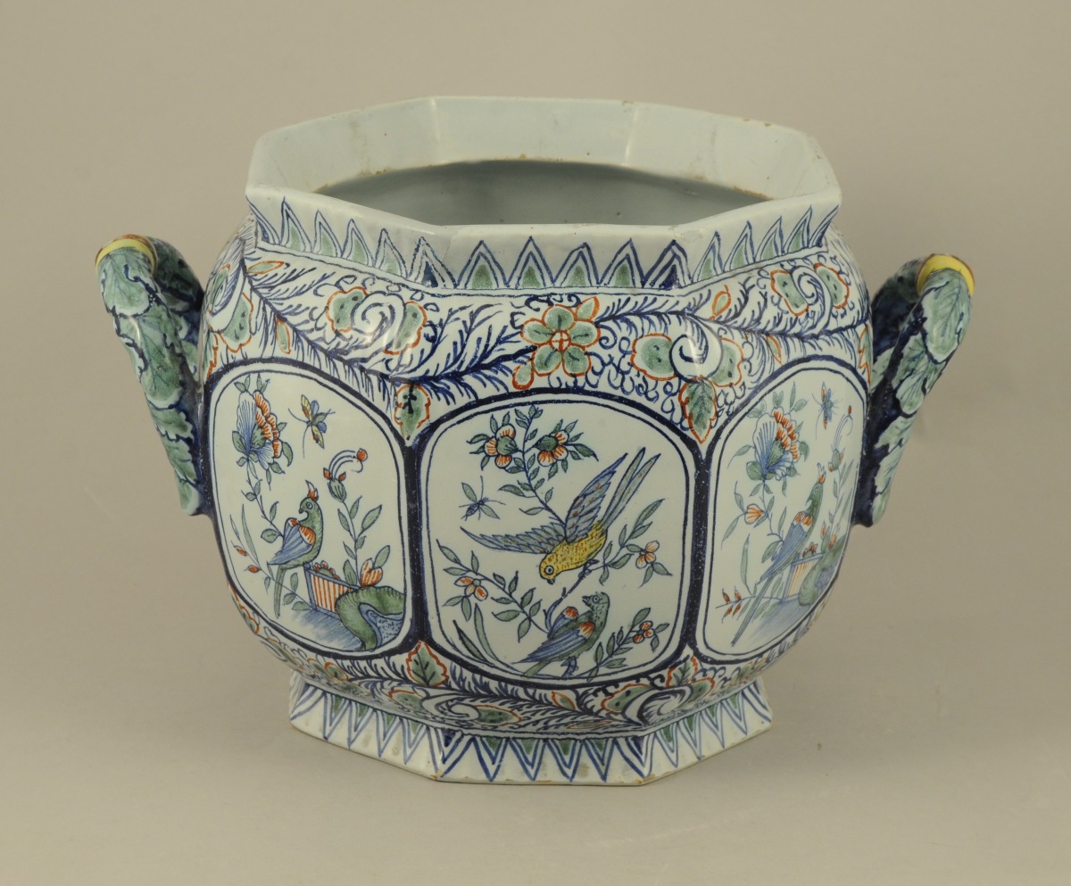 DESVRES. Manufacture Fourmaintreaux-Courquin. CACHE-POT octogonal en faïence. Décor polychrome d'oiseaux et de feuillages dans des réserves, de branchages fleuris et de dents de loup sur le col et la base. Anses simulant des tores de lauriers. Monogrammé AB et FC au revers.