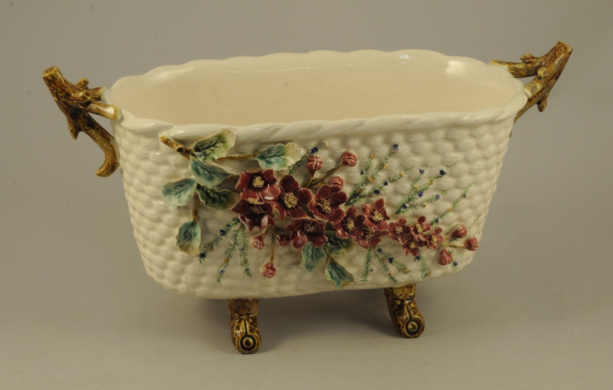 JOINT: JARDINIÈRE en faïence de couleur crème. Décor polychrome appliqué d'un branchage fleuri. Anses et pieds imitant des branchages. Début XXème. Haut. 22, Larg. 40, Prof. 18,5 cm.