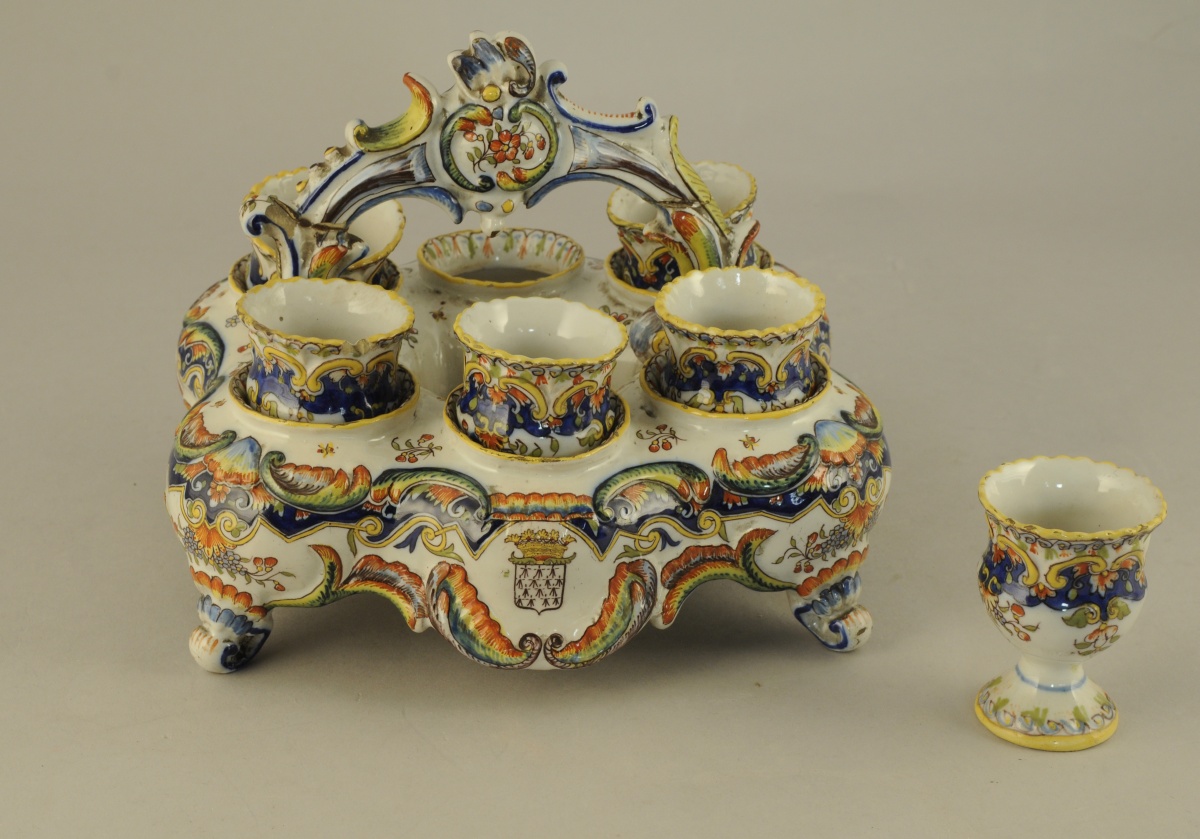 DESVRES. SUITE de 6 COQUETIERS avec leur support à anse en faïence stannifère à décor polychrome de grand feu. Coquetiers à bordures et piédouches godronnés, ornés de motifs floraux. Support reposant sur quatre pieds à volutes, à décor rocaille en relief, à décor peint de fleurs et des armes de Bretagne.