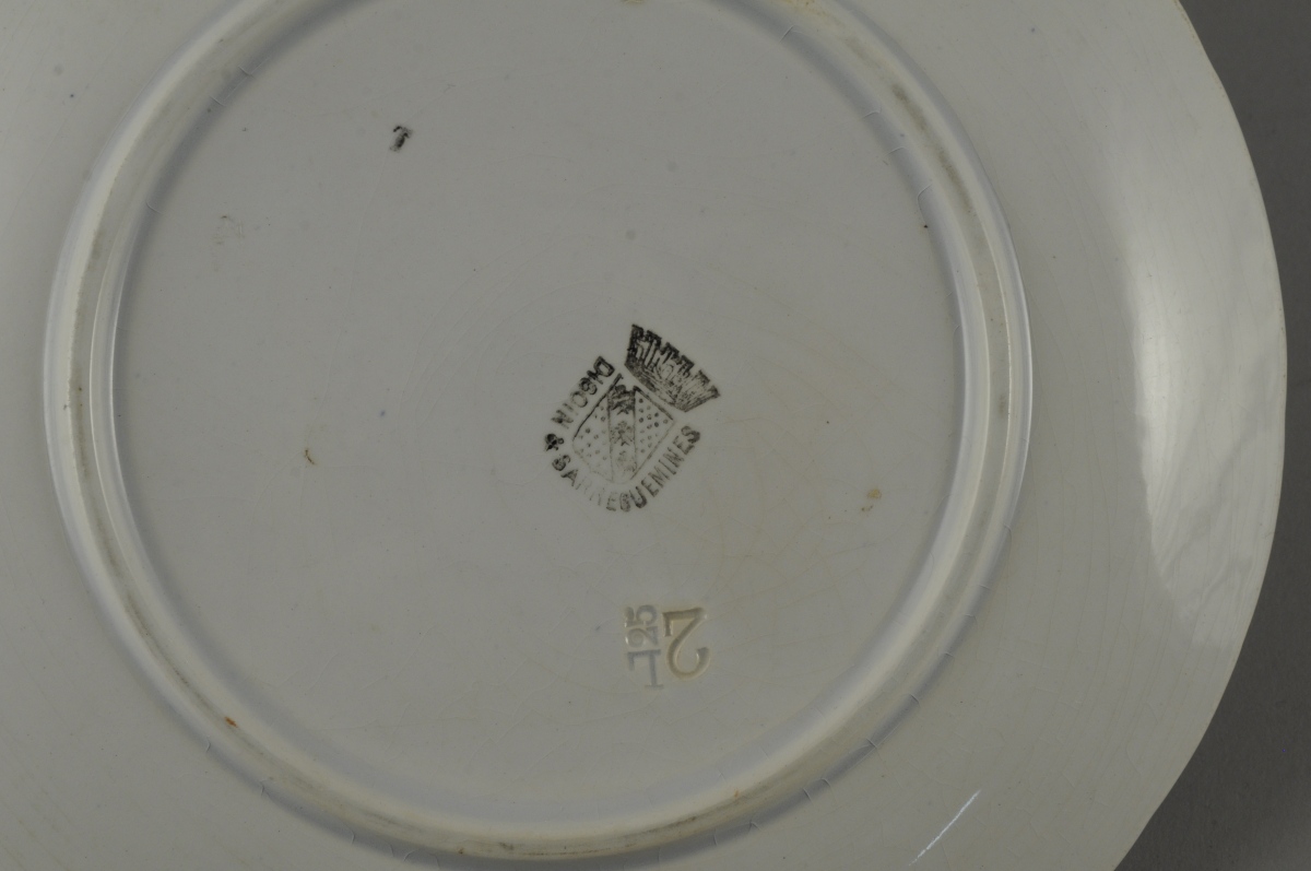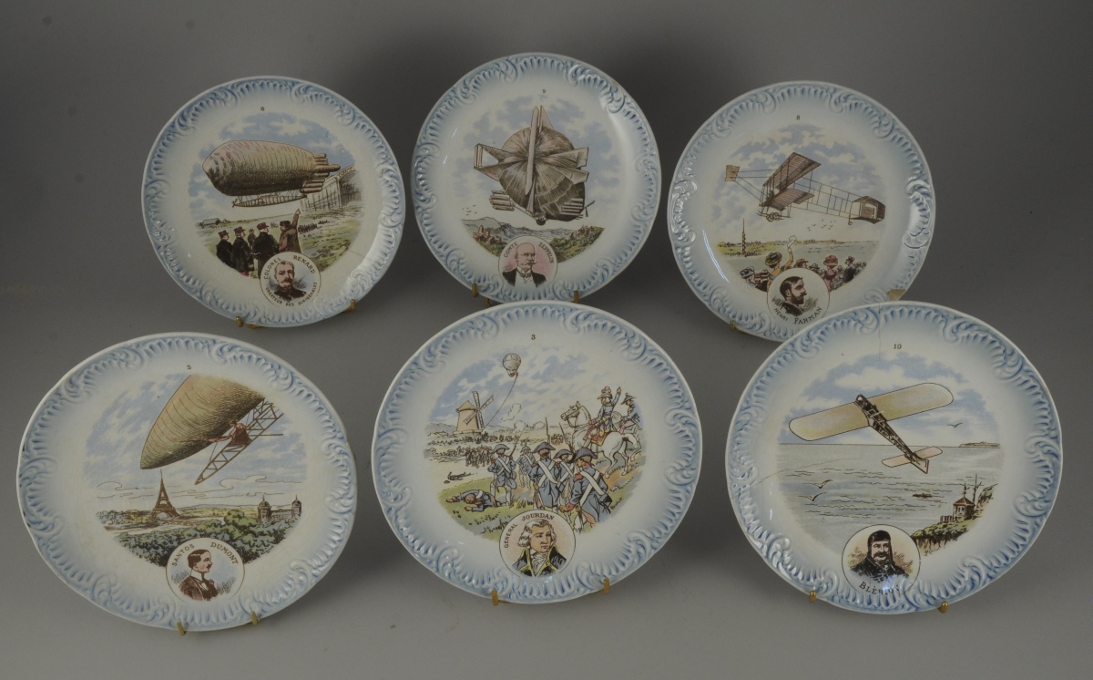 DIGOIN et SARREGUEMINES. Ensemble de SIX ASSIETTES en faïence fine "Aviation". Décor imprimé polychrome de scènes sur l'histoire de l'aviation avec en médaillon les portraits des inventeurs: "3. Général Jourdan / 5. Santos dumont / 6. Colonel Renard / créateur des dirigeables / 8. Henri Farman / 9. Comte Zeppelin / 10. Blériot". Frise de coquilles sur le bord. Dessins signés d' HENRIOT (Henri MAIGROT dit, 1857-1933). Marque au tampon au blason couronné "DIGOIN ET SARREGUEMINES" et en creux "2L25".