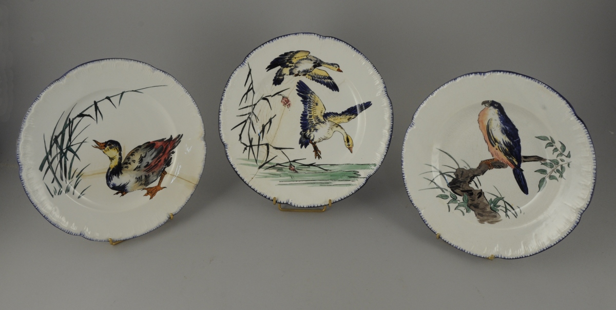 JOINT: deux assiettes en faïence à bord contourné à décor polychrome naturaliste sur le bassin d'oiseaux dans un paysage lacustre. Peignés et filet bleus sur le bord. Marquée "Escalier de cristal / Paris". Fin du XIXème. Diam. 26,5 cm. (fêle et restaurations).