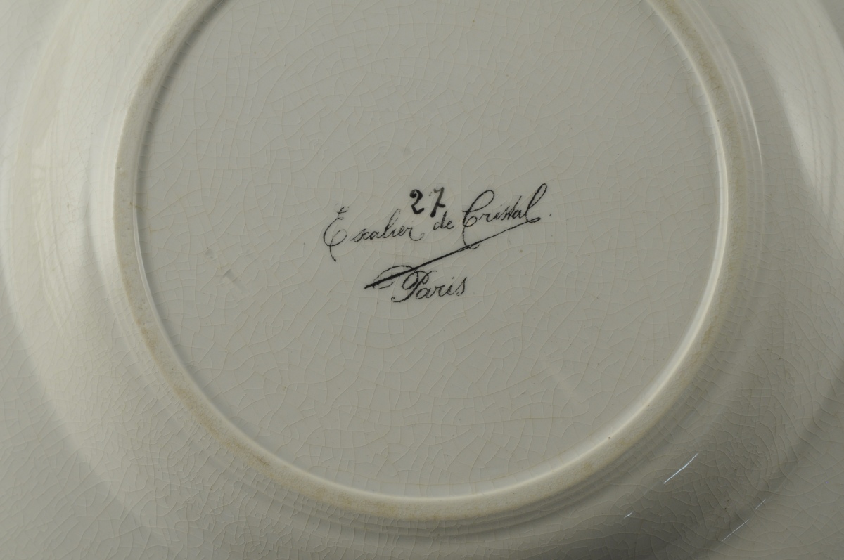 ESCALIER DE CRISTAL. ASSIETTE creuse en faïence à bord contourné à décor polychrome naturaliste sur le bassin d'un perroquet perché sur une branche noueuse. Peignés et filet bleus sur le bord. Marque "Escalier de cristal / Paris".