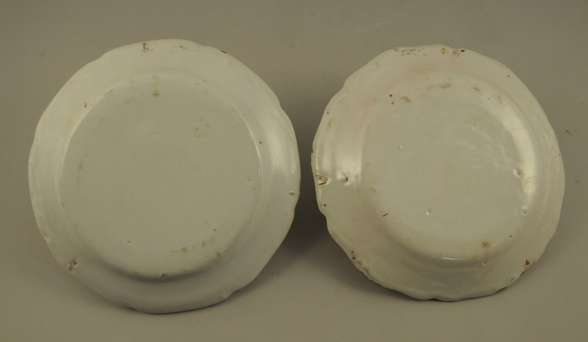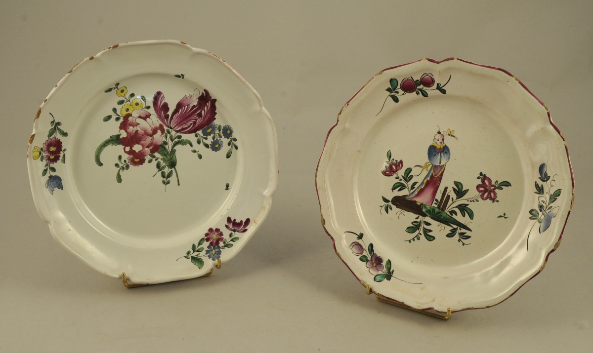 -ASSIETTE à bords contournés en faïence stannifère. Décor polychrome de petit feu figurant un Chinois sur un tertre fleuri, accompagné d'un papillon. Semis de fleurs sur l'aile. Diam. 24,5 cm.
