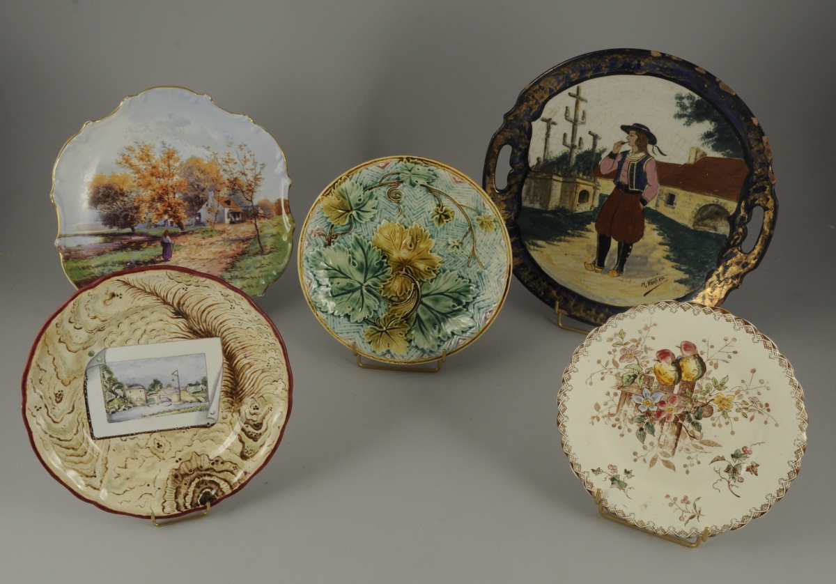- M. VAUTIER. PLAT de service en faïence craquelée représentant un Breton dans un paysage rural en costume traditionnel fumant une pipe devant un calvaire. Signé, inscription "BRETAGNE" au revers. M. Vautier est une faïencerie de Caen. Diam. 30 cm. (égrenures)
