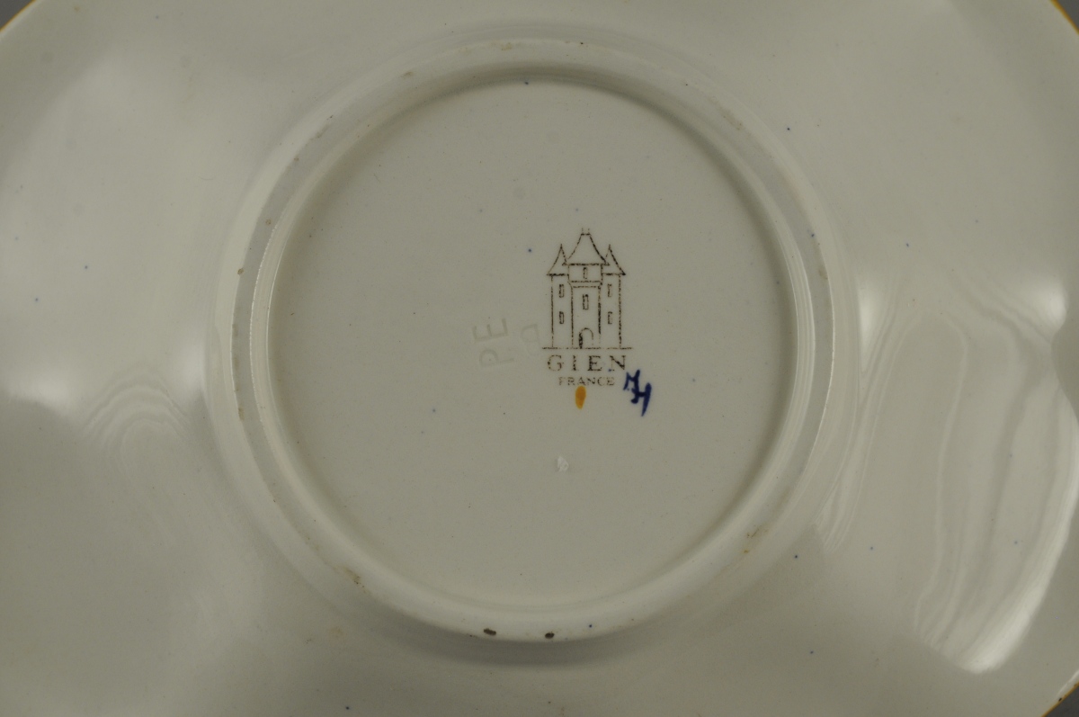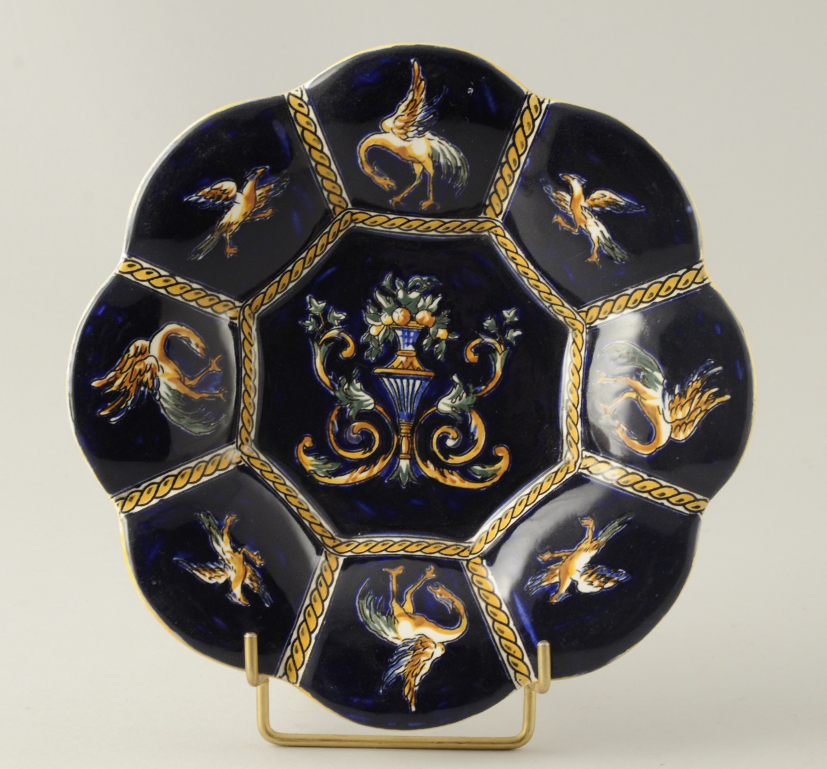 GIEN. ASSIETTE en faïence à bord lobé à fond bleu nuit. Décor polychrome sur le bassin d'un vase et de rinceaux feuillagés et sur le bord de huit griffons dans des réserves à bords torsadés. Marque de Gien au château 1960 - 1971 et marque en creux "PEB".