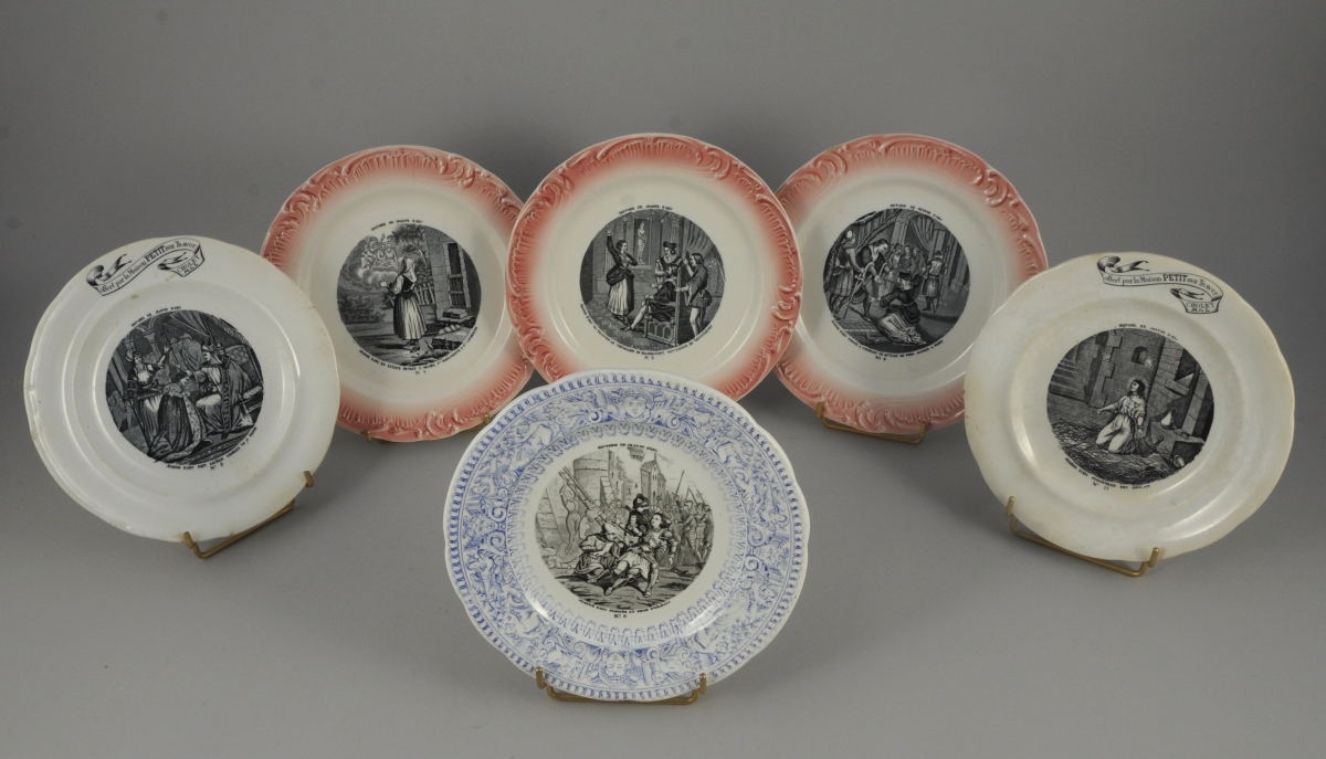 - DEUX ASSIETTES à bord contourné. Décor en noir sur le bassin de scènes de la vie de Jeanne d'Arc légendées. Philactère portant l'inscription "Offert par la Maison PETIT rue Travot / CHOLET M&L". XIXème. Diam. 19 cm.