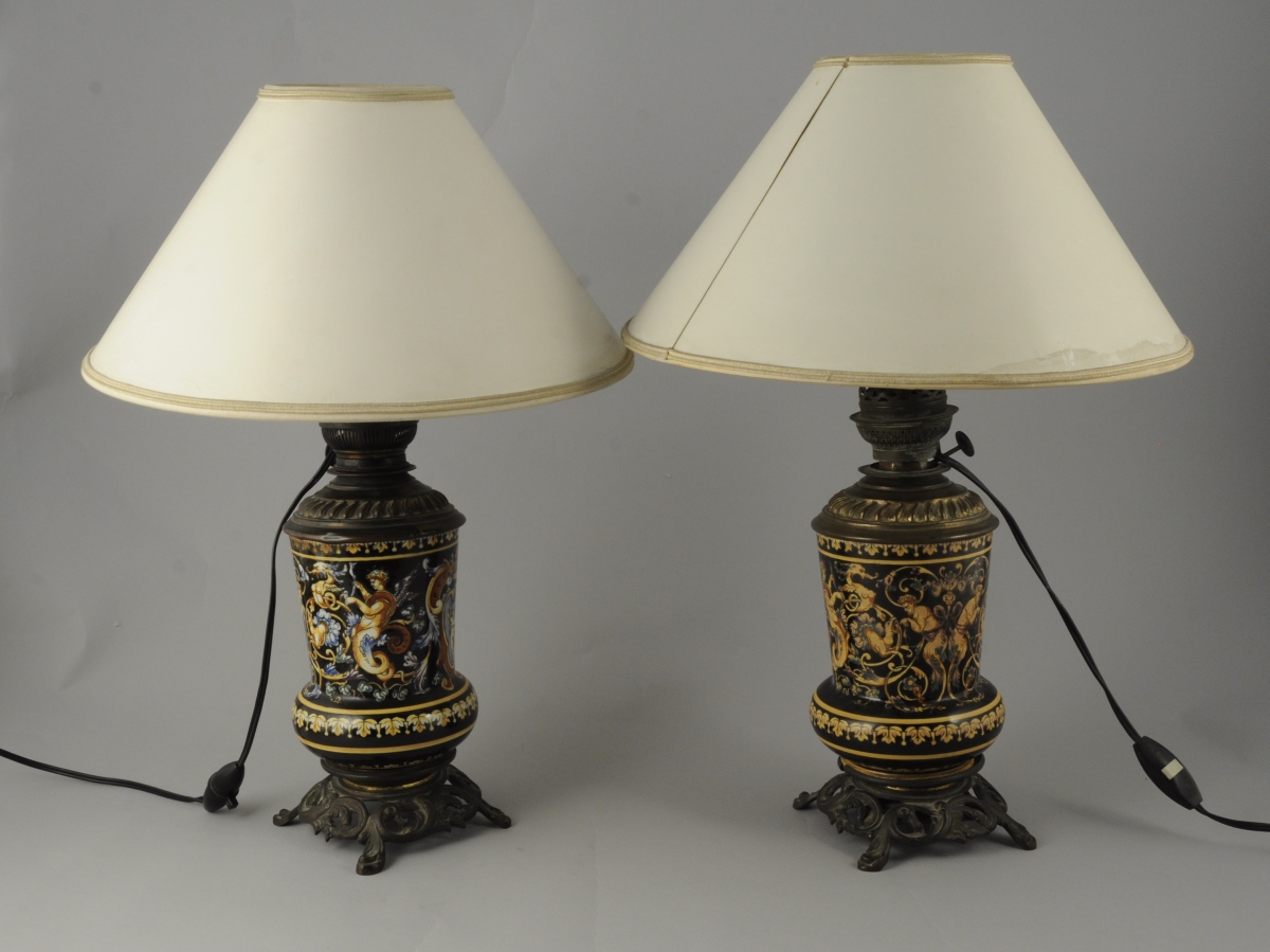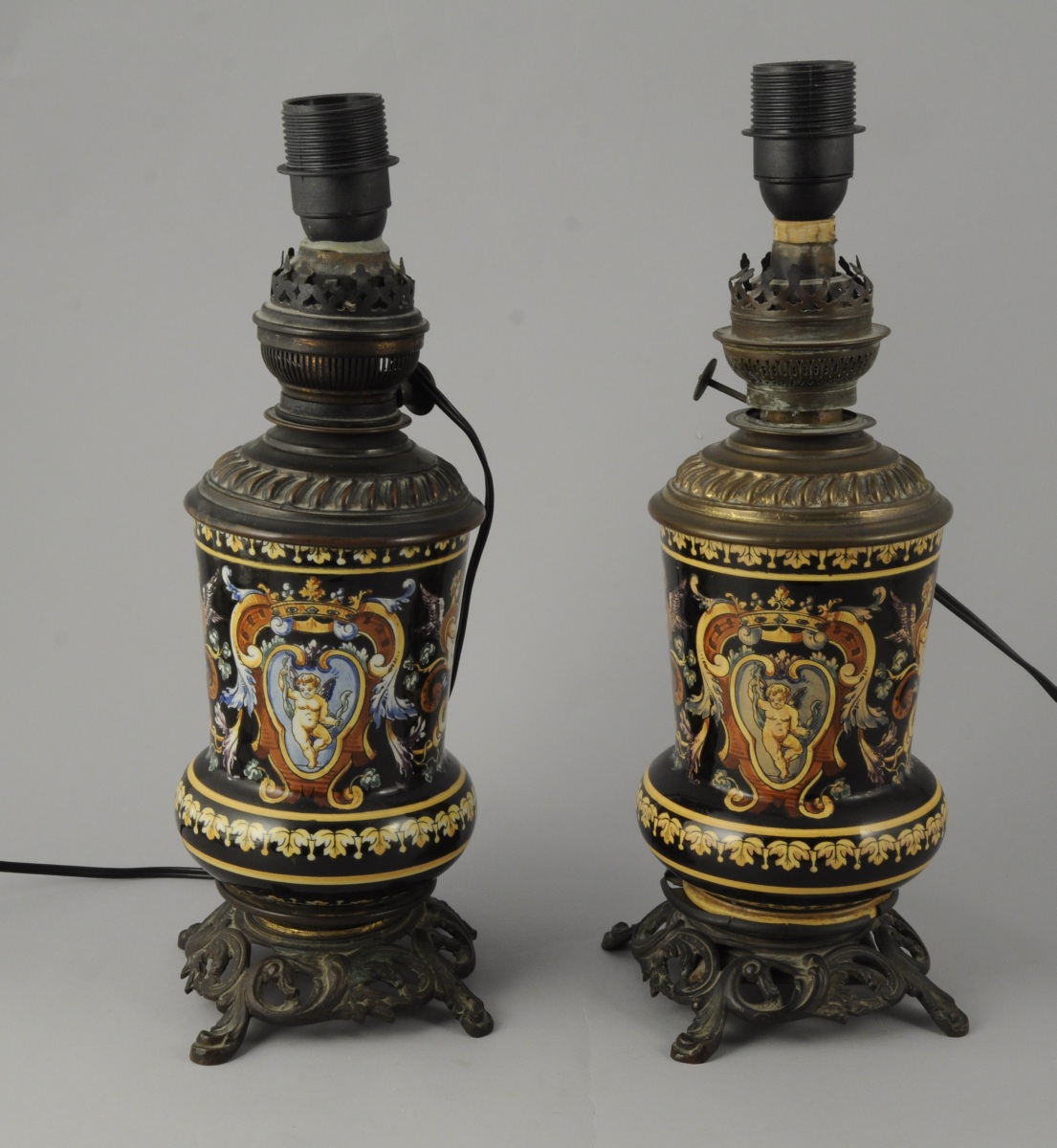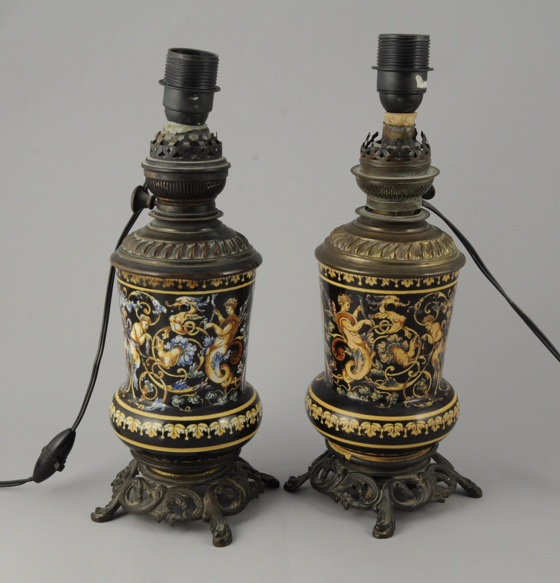 GIEN. PAIRE de LAMPES en faïence à fond noir. Décor polychrome d'un putto dans un cartouche couronné et de grotesques. Monture en bronze. Anciennes lampes à pétrole montées à l'électricité.