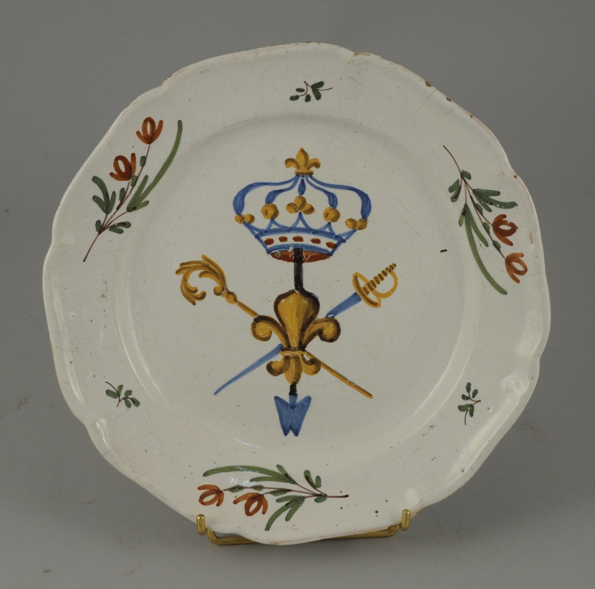 LA ROCHELLE. ASSIETTE à bord contourné en faïence à décor polychrome au centre des Trois Ordres couronnés, d'une fleur de lys et branchages fleuris sur l'aile.