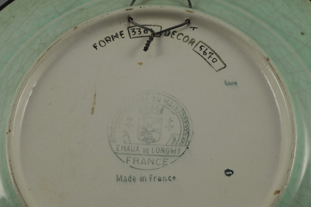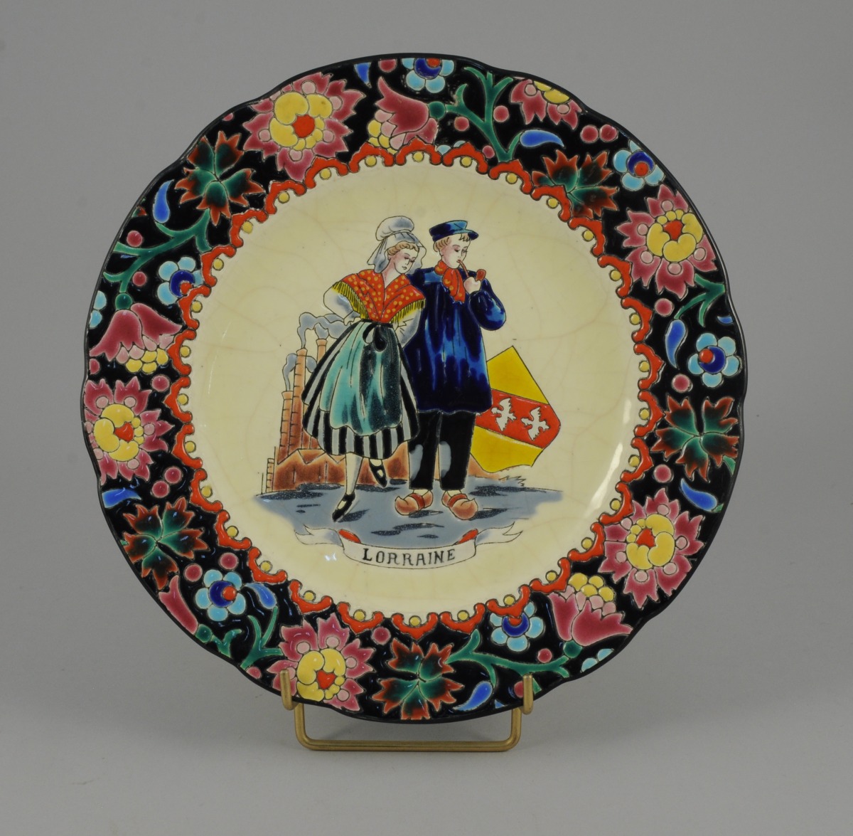 LONGWY. ASSIETTE régionale à décor d'un couple de lorrains en habits traditionnels, d'une usine et des armes de la Lorraine sur fond crème craquelé. Le marli souligné d'une frise de motifs festonnés. Sur l'aile, des fleurs polychromes sur fond noir. Marque manuscrite: Forme 3301, décor 5670. Marque cachetée au blason couronné entouré de deux croix de Lorraine, DÉCORÉ à la MAIN ÉMAUX de LONGWY FRANCE.