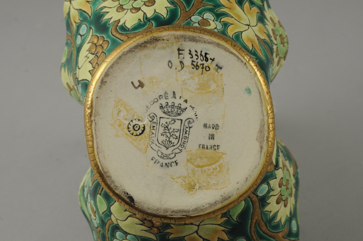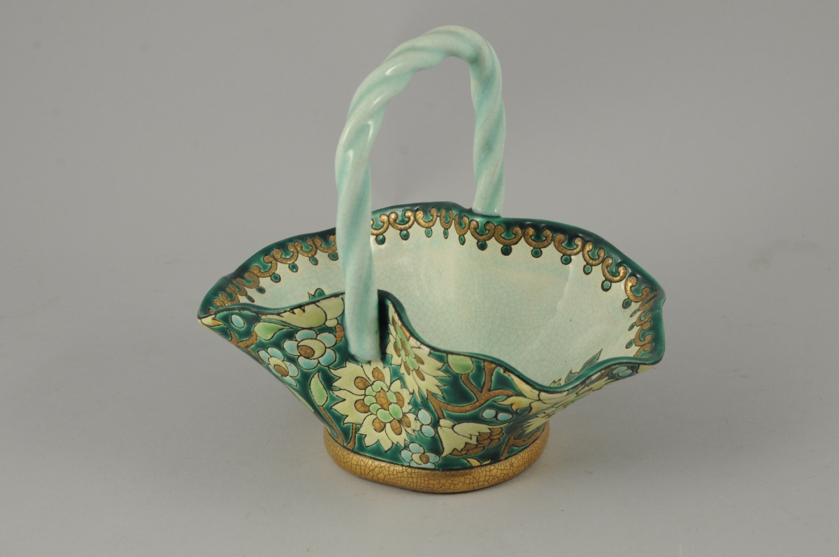 LONGWY. PANIER À ANSE TORSADÉE en faïence, à décor en camaïeu vert et or de fleurs à l'extérieur ; et de fleurs vertes ainsi que d'une frise de perles et d'agrafes à l'intérieur. Anse vert d'eau. Tampon au blason courroné marqué "Émaux de Longwy" et inscription à l'encre "Forme: 3365 / Décors: 5670"