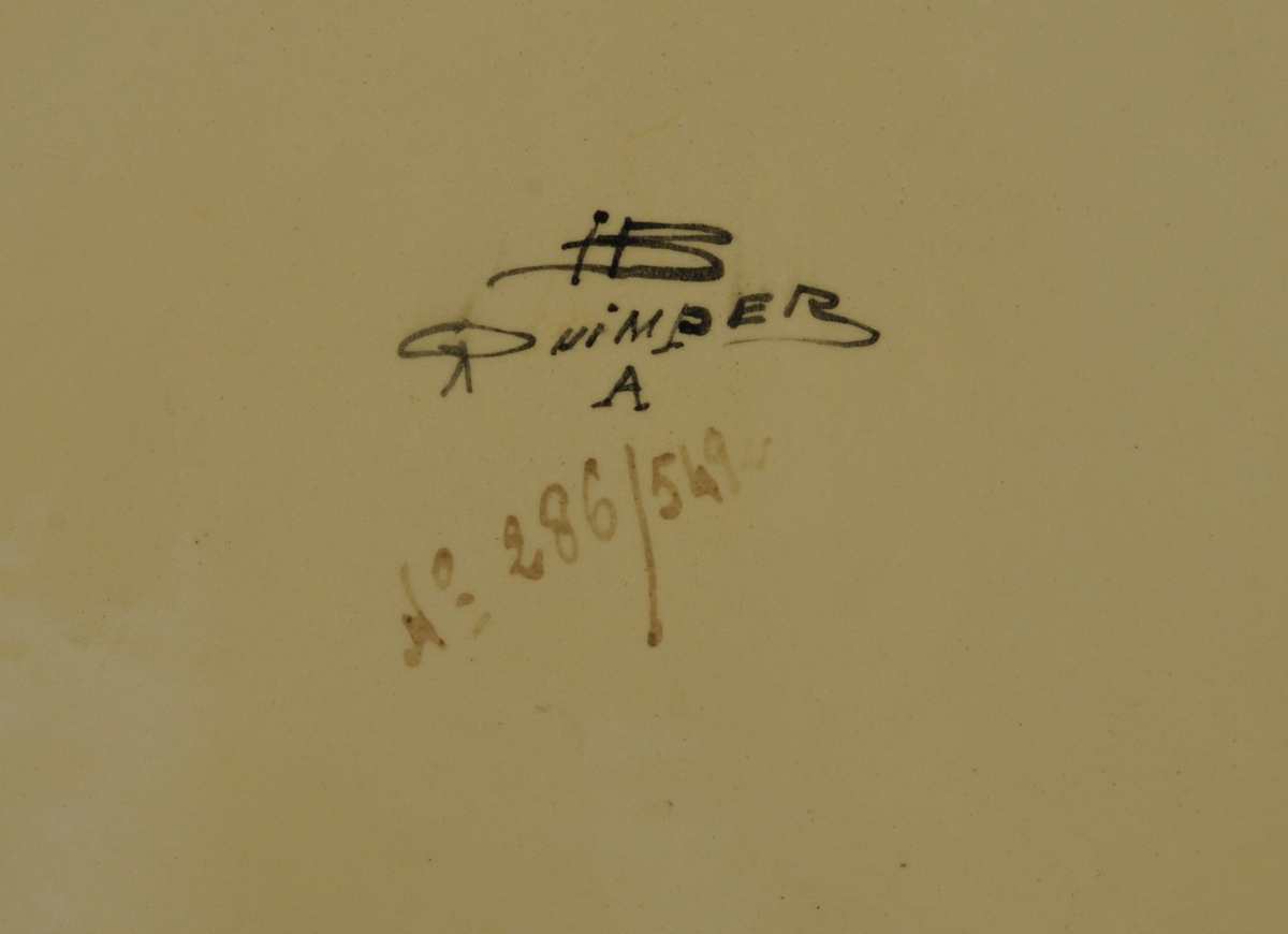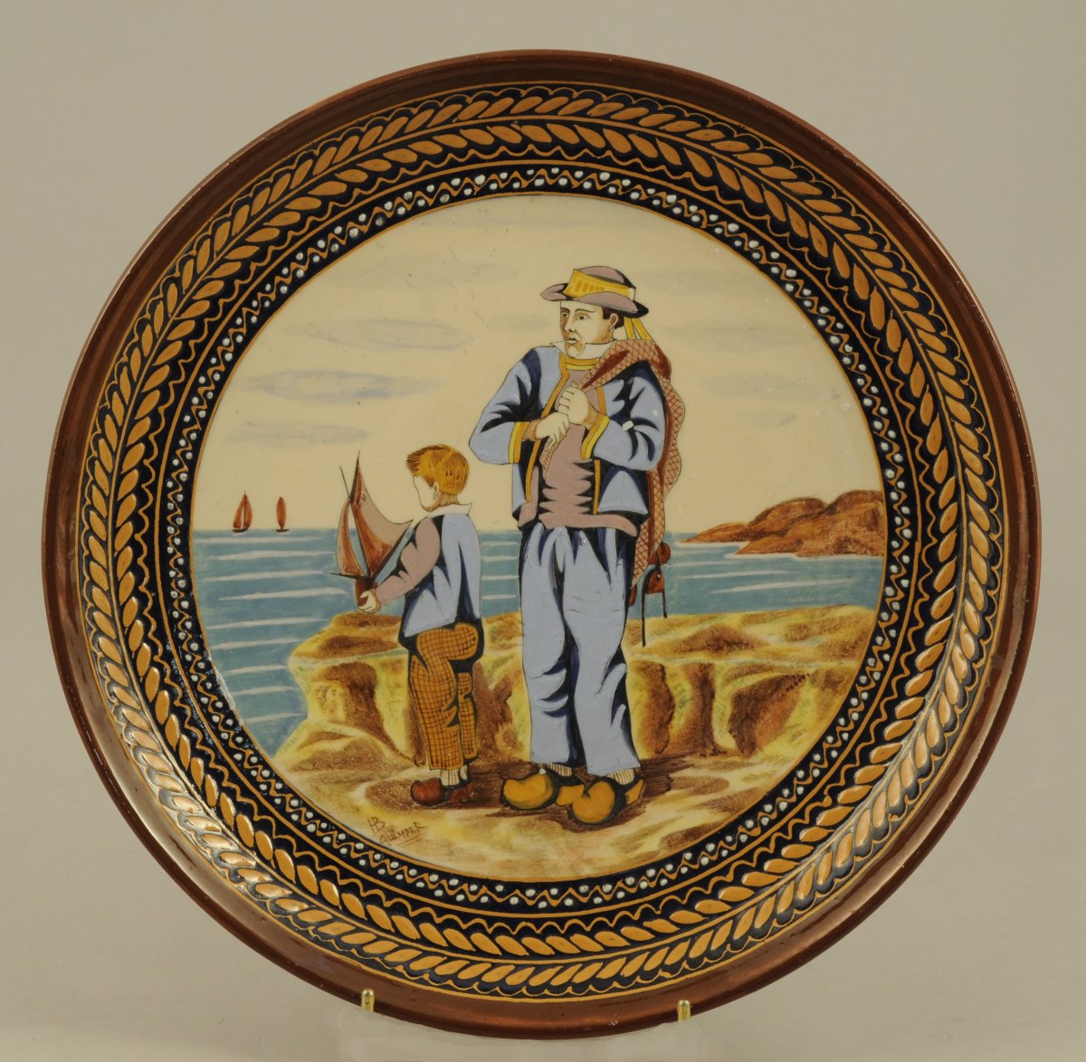 JOINT: QUIMPER. PLAT rond en faïence. Décor polychrome d'un pêcheur breton et de son fils dans un paysage maritime. Frises géométriques sur l'aile. Marqué. Diam. 30 cm.