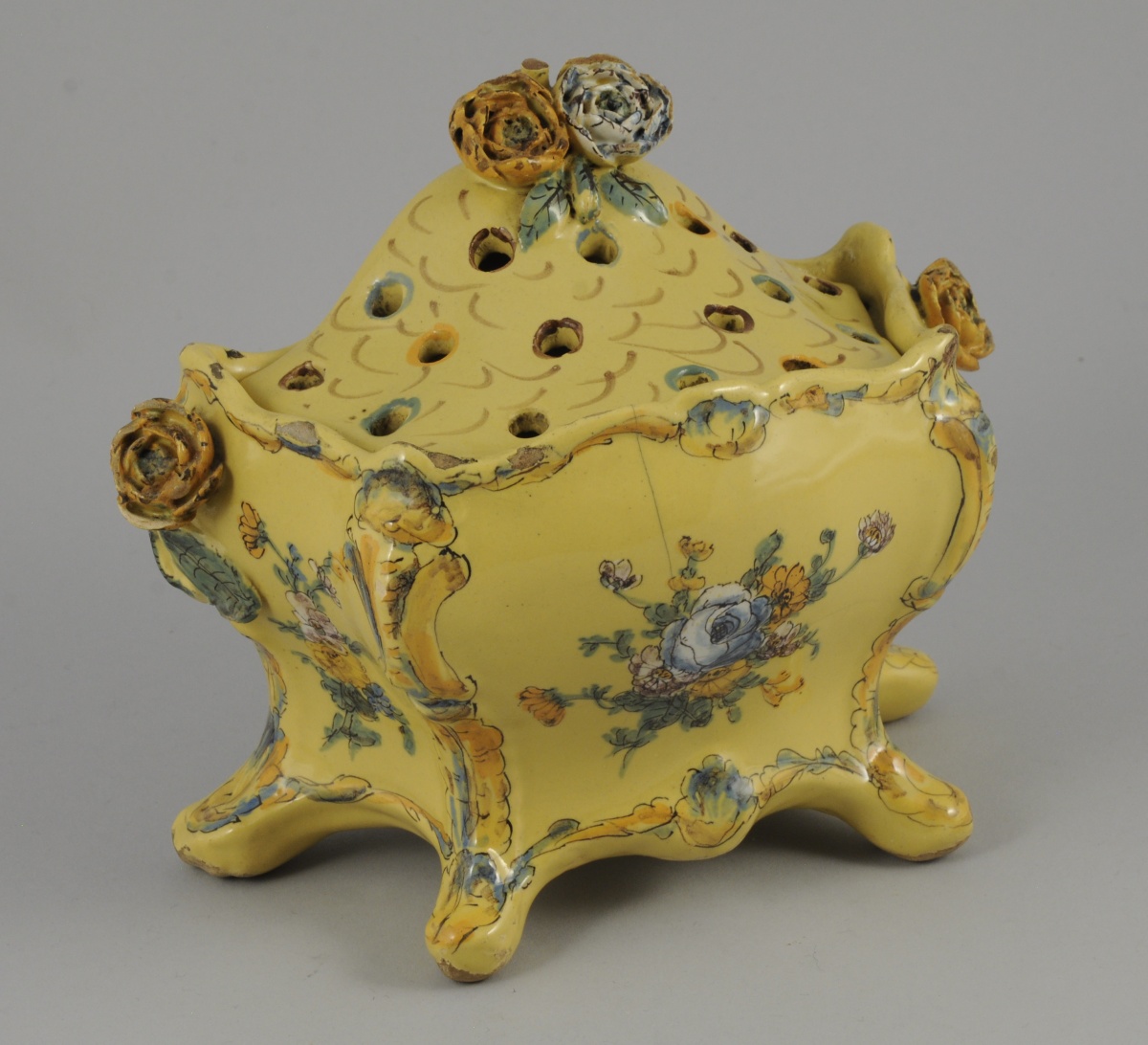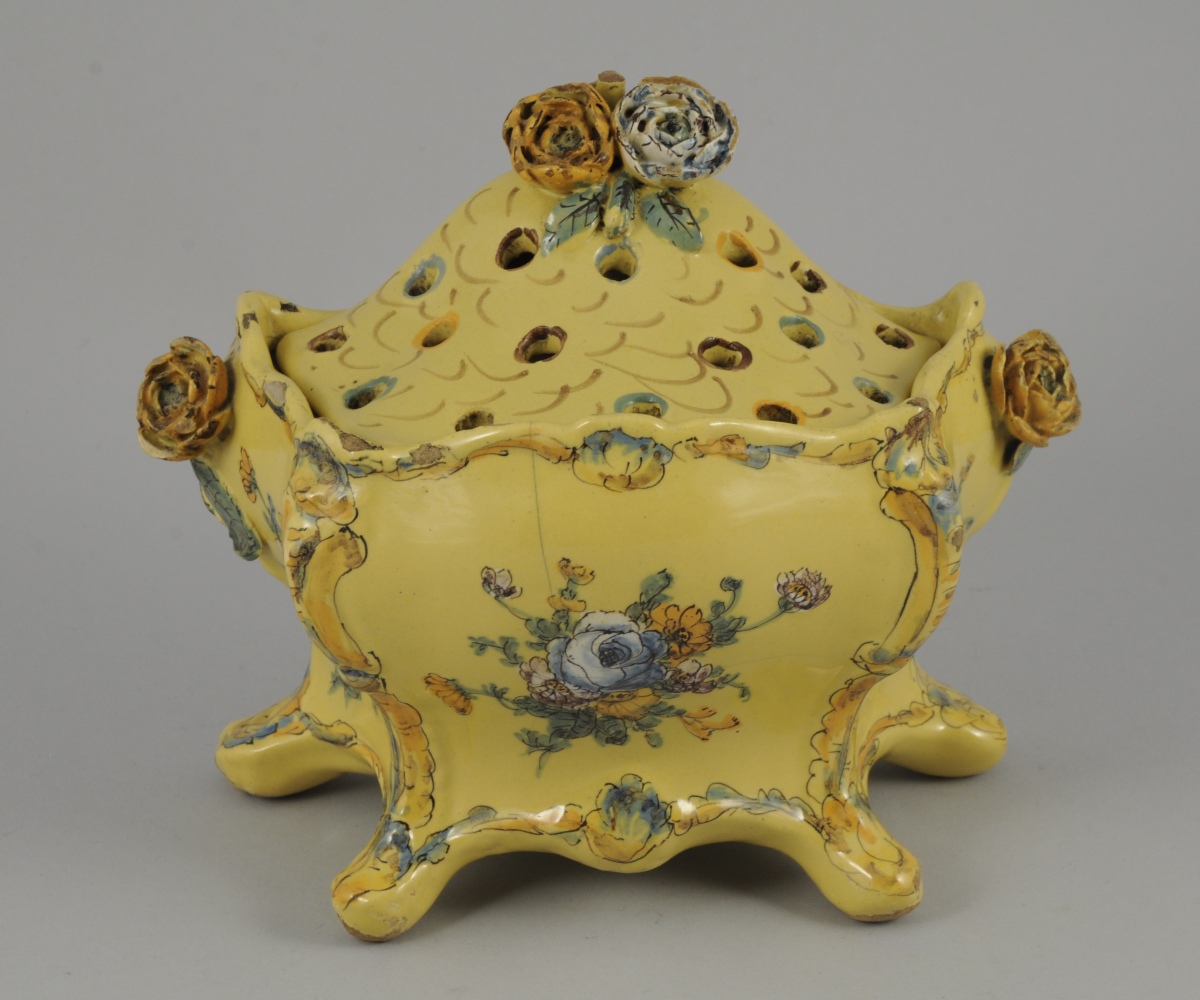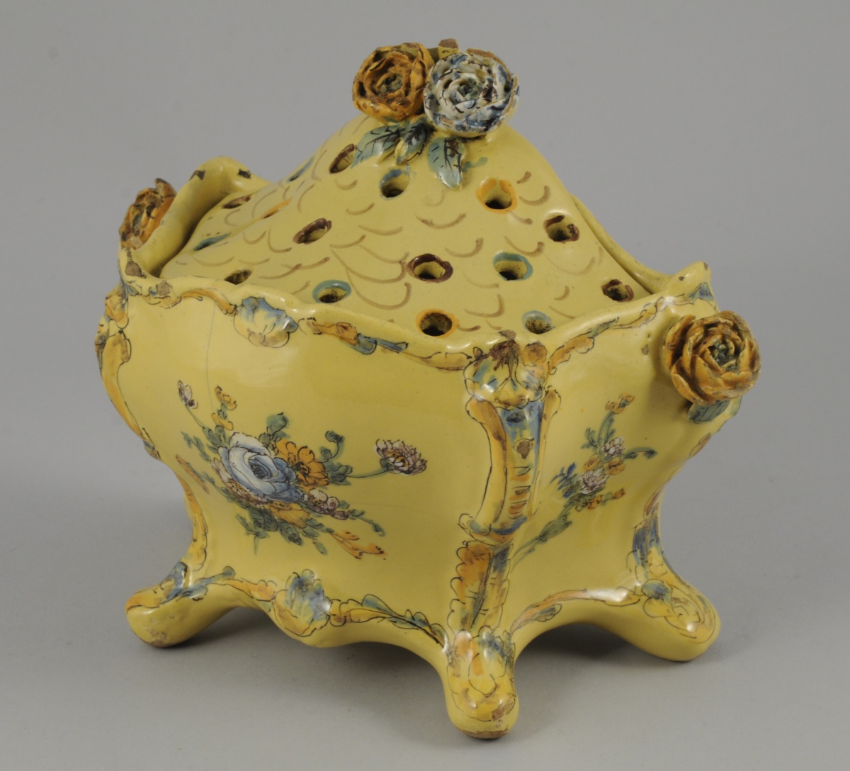 MONTPELLIER. BOUQUETIÈRE murale en faïence de forme contournée à fond jaune. Décor polychrome sur la panse d'un bouquet à la rose bleue, et sur les côtés de petits bouquets de fleurs. Arrêtes ornées de rinceaux. Roses en relief sur les côtés et le couvercle. XVIIIème.