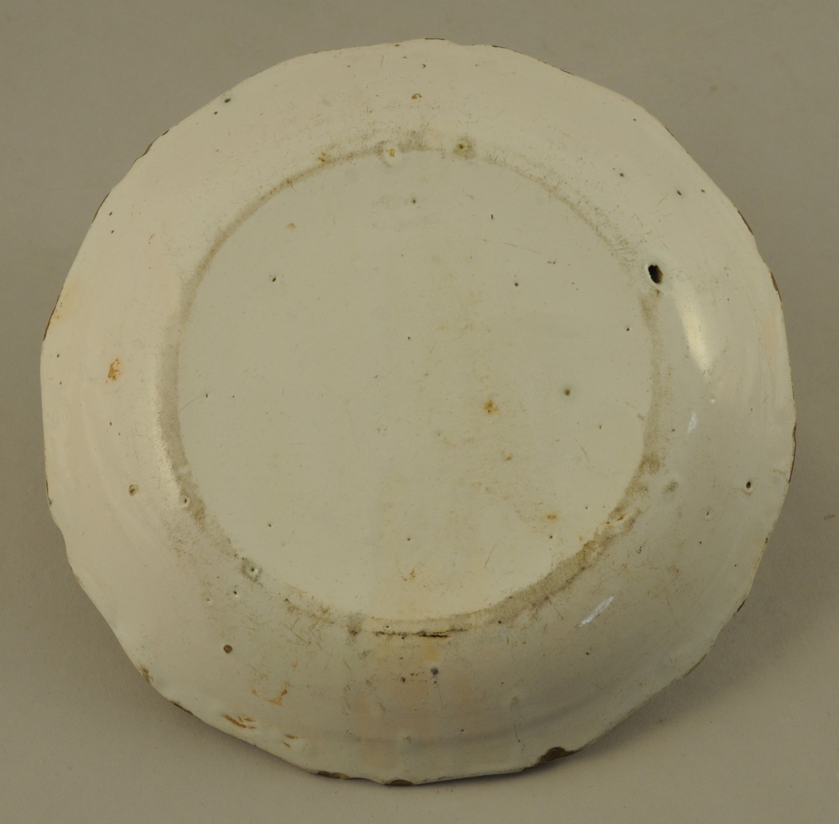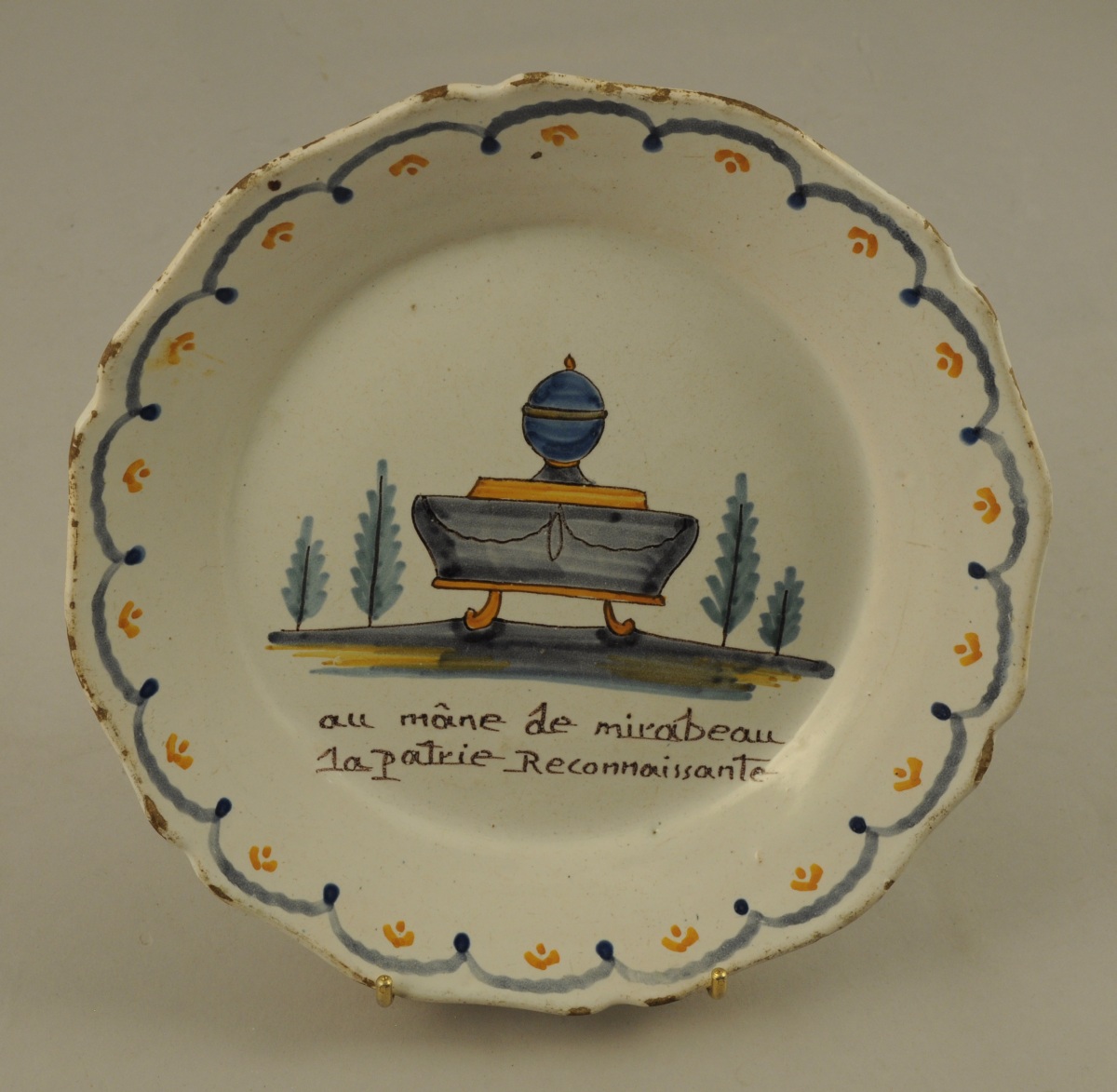 NEVERS. ASSIETTE à bords contournés en faïence stannifère. Décor polychrome de grand feu, figurant un tombeau, sur fond de paysage, avec l'inscription "au mâne (sic) de mirabeau la patrie reconnaissante". Guirlande bleue et fleurons jaunes sur l'aile.