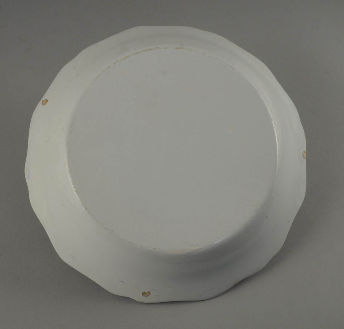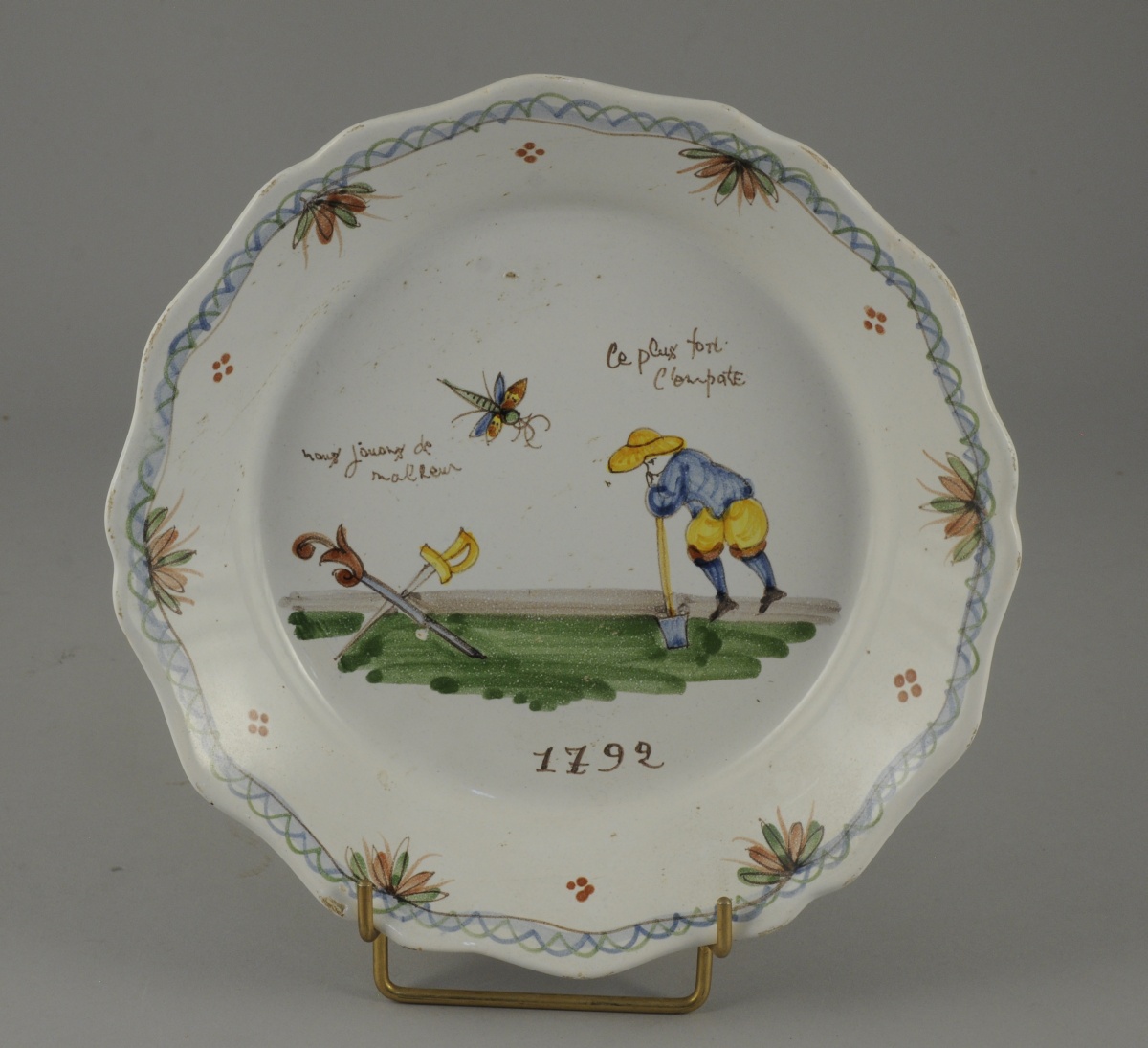 NEVERS. Assiette révolutionnaire en faïence à bords contournés. Décor polychrome figurant l'abolition des privilèges marquée "1792 / Nos jours de malheur / le plus fort l'emporte". Frise devaguelettes et feuillages sur le bord.