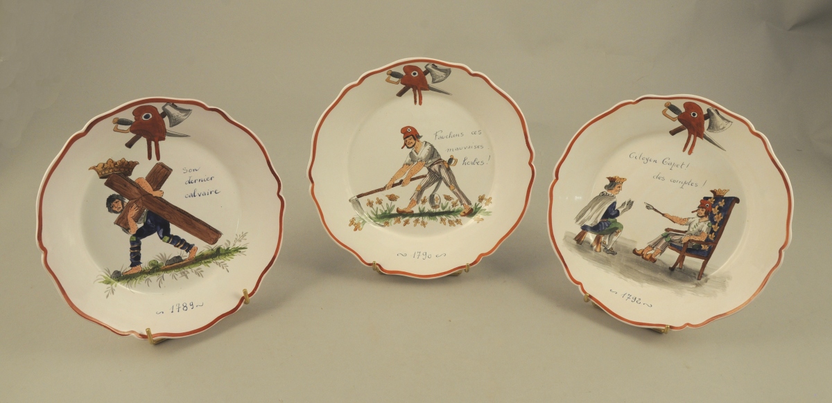NEVERS. Suite de trois ASSIETTES en faïence stannifère à thème révolutionnaire, avec les inscriptions: "Son dernier calvaire", "Fauchons ces mauvaises herbes" et "Citoyen Capet! Des comptes!". Marque au nud vert.