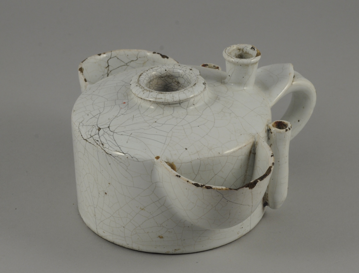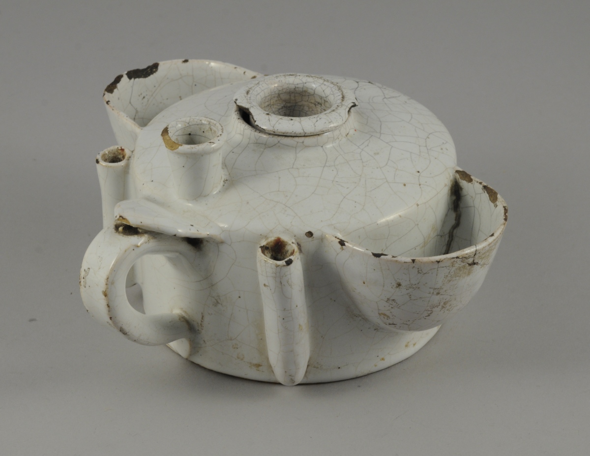 NIVERNAIS. ENCRIER en forme de bougeoir en faïence émaillée blanc muni d'une anse. Un godet encrier, trois piques- plume et deux réceptacles.