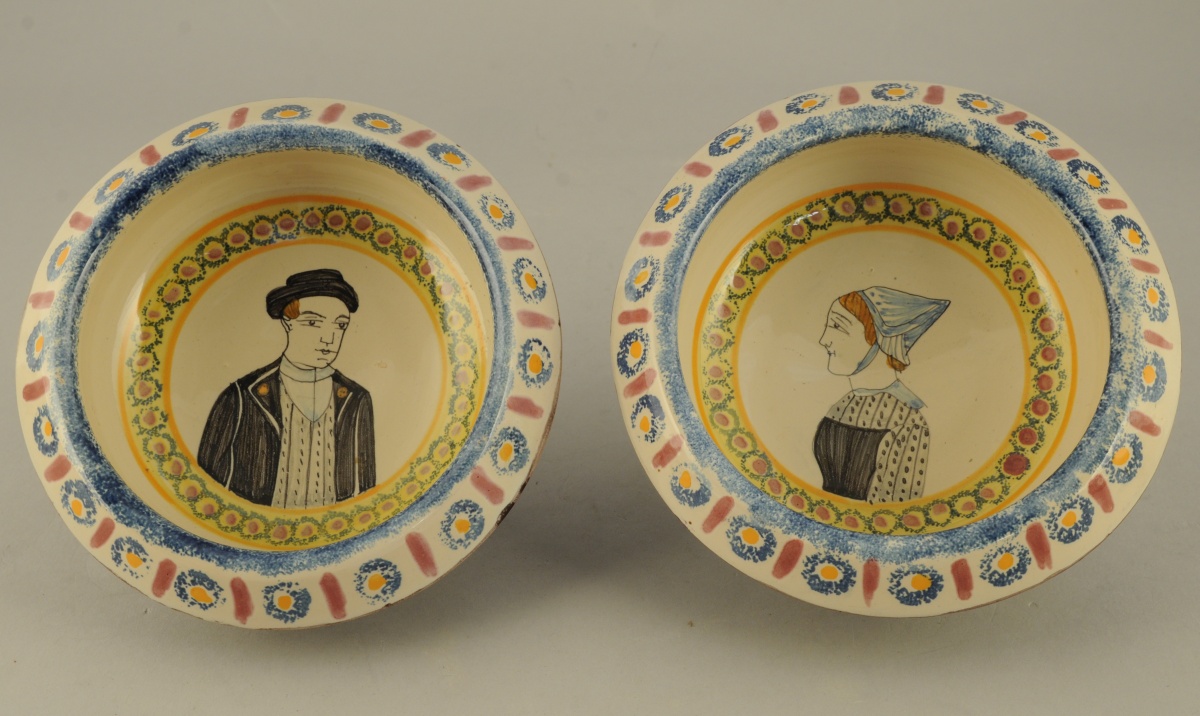 -HENRIOT. PAIRE de BOLS à LANDIER en faïence polychrome présentant dans le bassin un portrait en buste d'un Breton et un portrait de profil d'une Bretonne. Signé. Circa 1950. Diam. 18 cm.