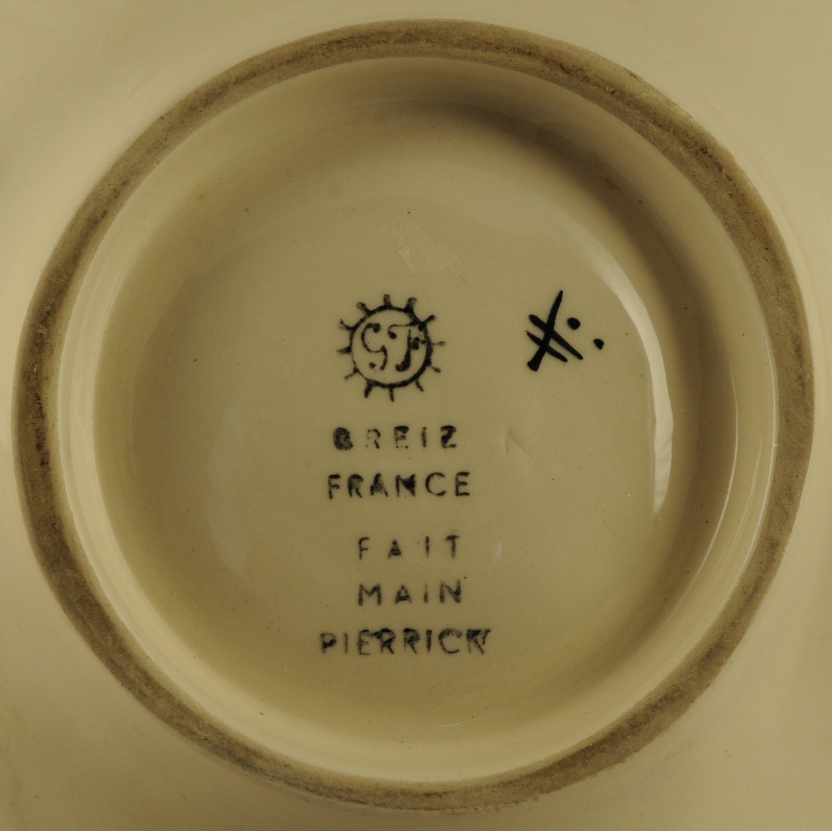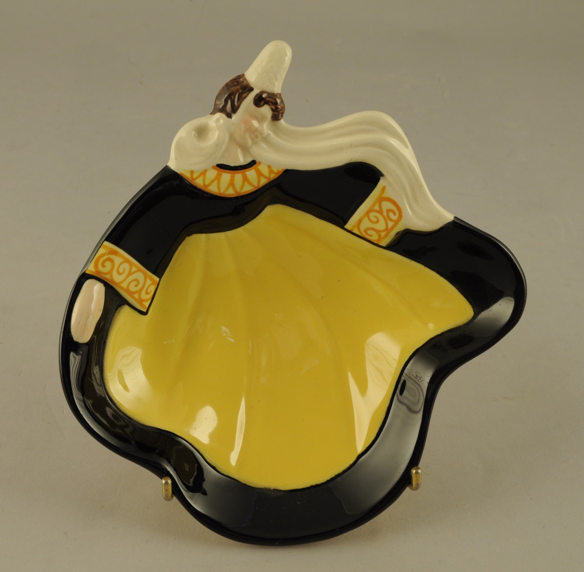 - COUPE en faïence polychrome adoptant la forme d'une Bigoudène en mouvement. Marque "BREIZ / FRANCE / FAIT / MAIN / PIERRICK". Larg. 18 cm.