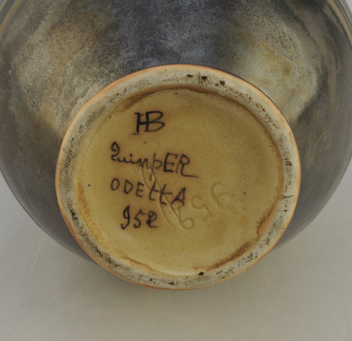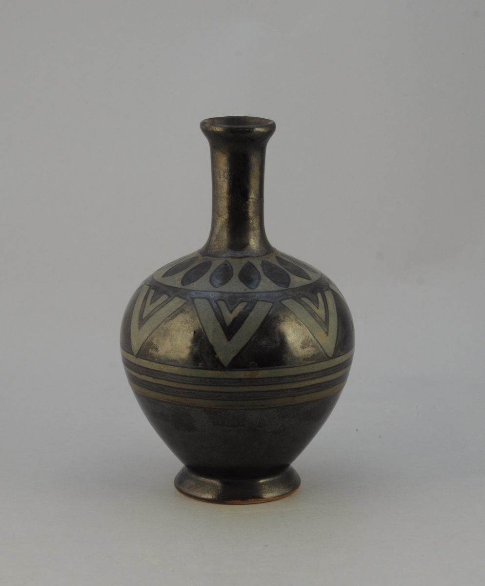 QUIMPER. ODETTA . VASE à long col à large panse en grès polychrome. Décor géométrique. Manufacture de La Hubaudière signé et numéroté "952".