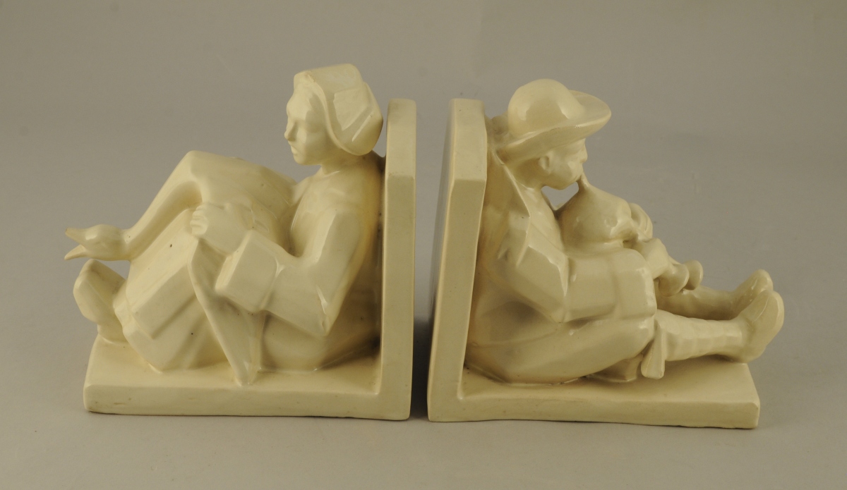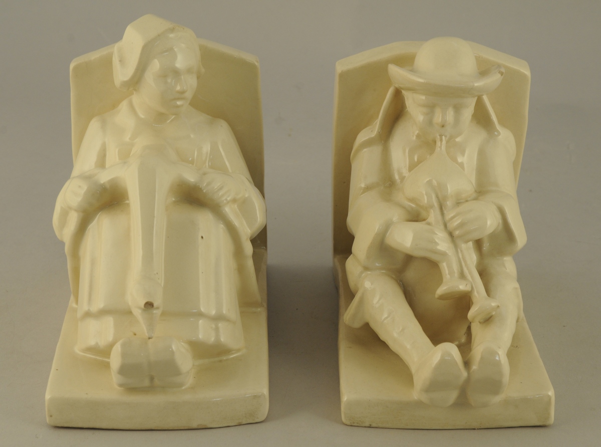 QUIMPER. PAIRE DE SERRE-LIVRES en faïence représentant un breton jouant du biniou et une bretonne tenant une oie sur ses genoux. Marque au revers "FRANCE / HD / 1302" accompagnée d'une ancre marine.