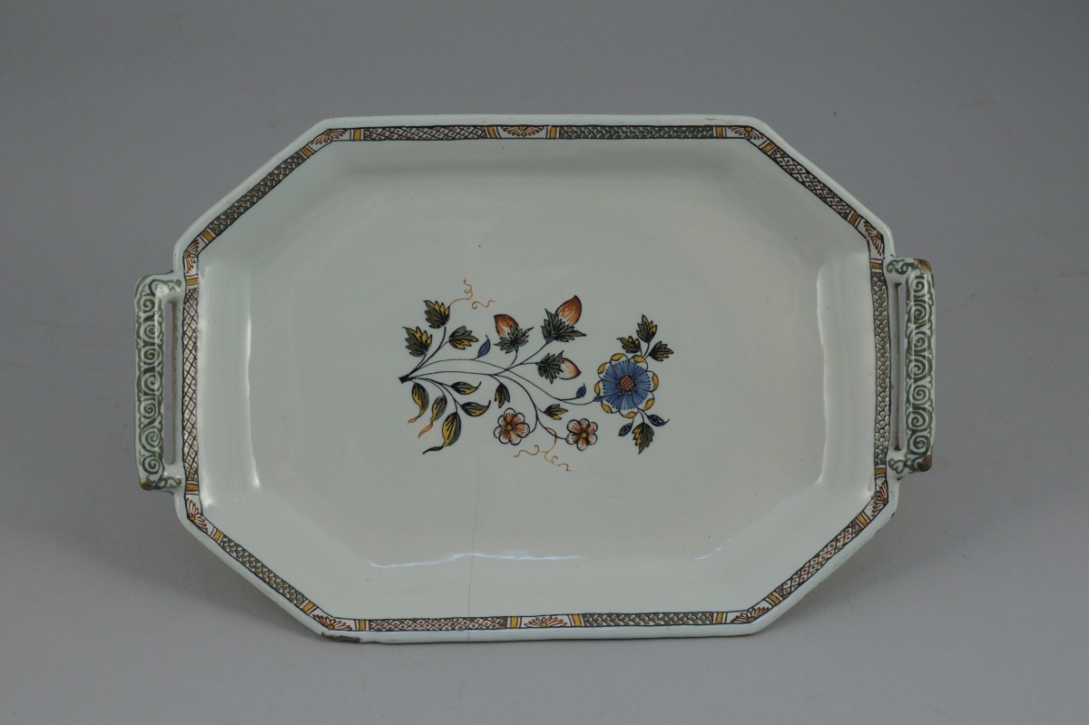 ROUEN. BANNETTE rectangulaire à pans en faïence à décor polychrome floral, anses latérales à motifs de volutes.