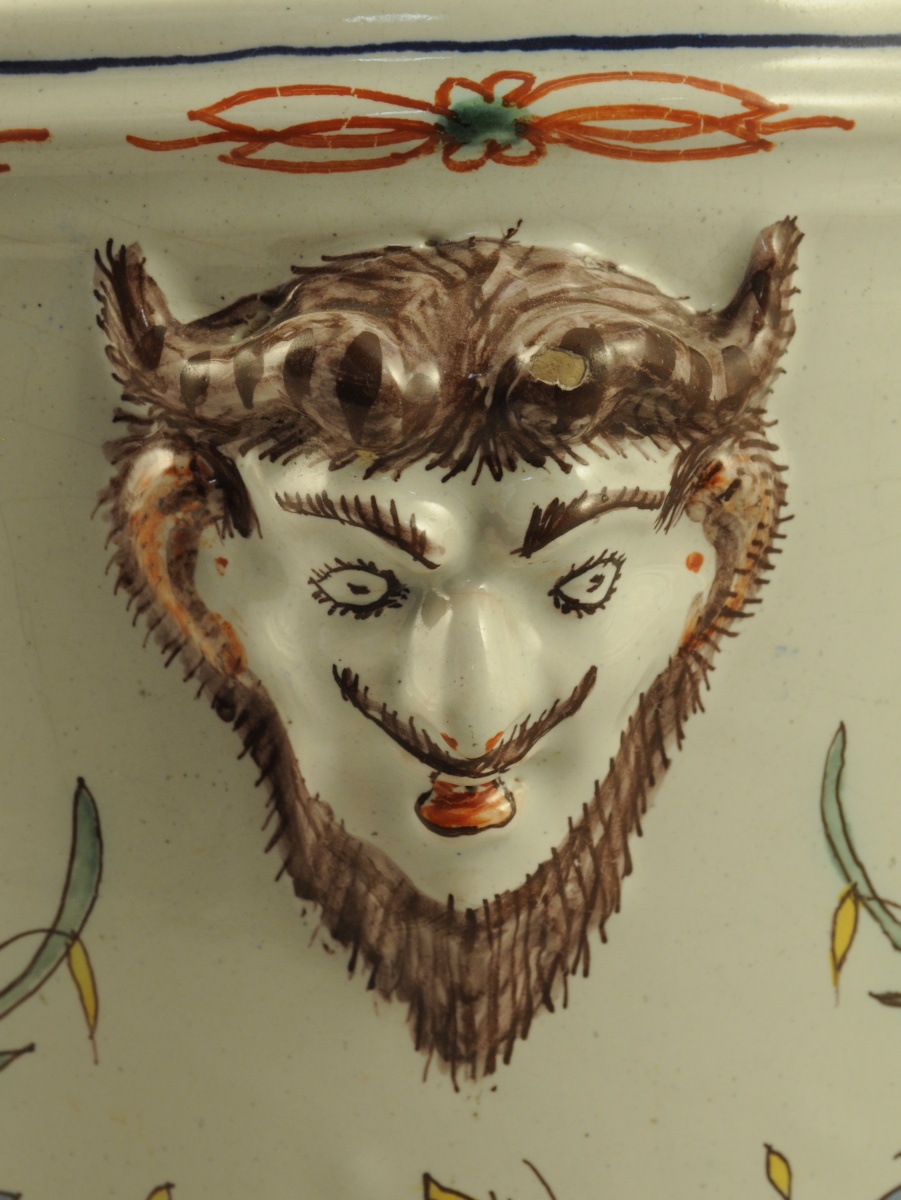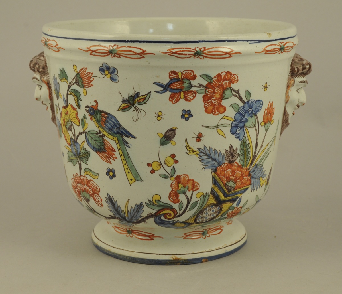 ROUEN. CACHE-POT en faïence et son plateau. Décor polychrome "à la corne d'abondance", filets bruns et bleus sur le bord. Prises en forme de mascarons.