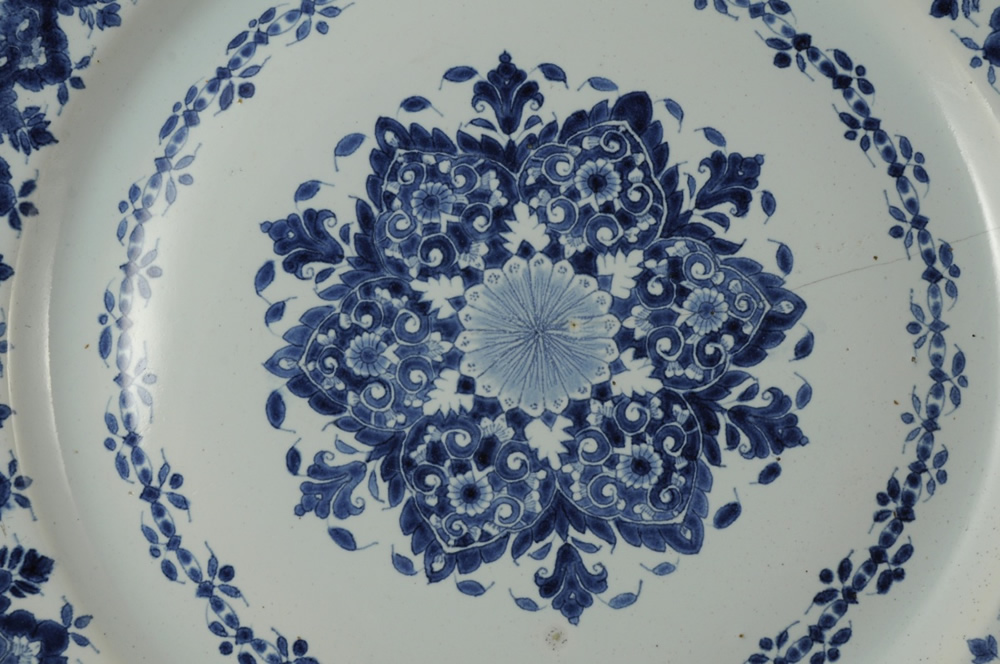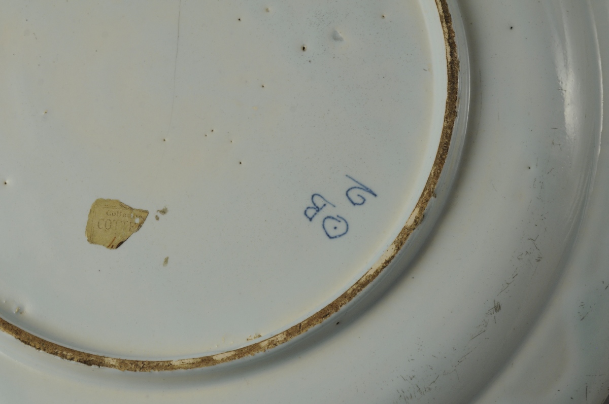ROUEN. PLAT circulaire en faïence stannifère. Décor en camaïeu bleu de grand feu d'une rosace au centre et de lambrequins sur l'aile. Porte au revers une marque peinte "OB / 2". Ancienne étiquette de collection: "Collection COTTEA..."