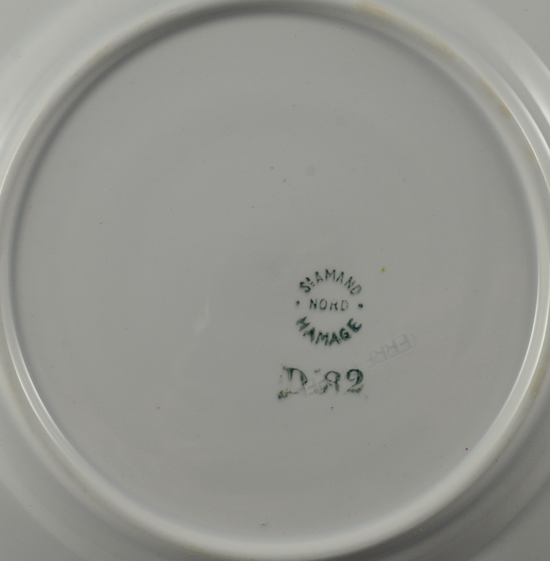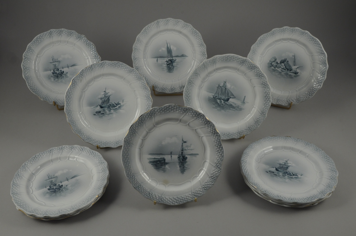 SAINT-AMAND et HAMAGE. SERVICE à dessert en faïence comprenant 12 assiettes. Décor en grisaille au centre d'un paysage maritime représentant des bateaux de pêcheurs près d'une côte. Décor en relief genre "grain de riz" sur l'aile et filet argent sur le bord. Marque "Saint-Amand / Nord / Hamage / D. 32", marque en creux "Terre de fer".