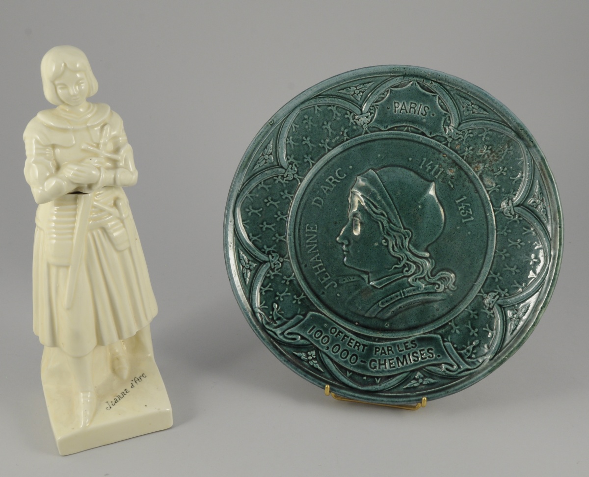 - PLAT commémoratif en faïence émaillée vert. Décor en léger relief figurant le profil de Jeanne d'Arc. Fenestrages, semis de fleurs de lys et feuillages sur l'aile. Marqué "PARIS / JEHANNE D'ARC / 1411-1431 / OFFERT PAR LES 1000 000 CHEMISES". Décor signé Mercier. XIXème. Diam. 29 cm. (quelques bulles)