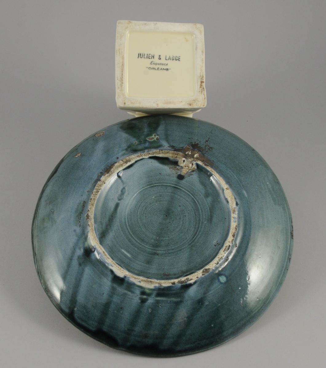 - BOUTEILLE en faïence crème représentant Jeanne d'Arc. Marquée "JULIEN & LABBÉ liqueurs orléans". XIXème. Haut. 32 cm.