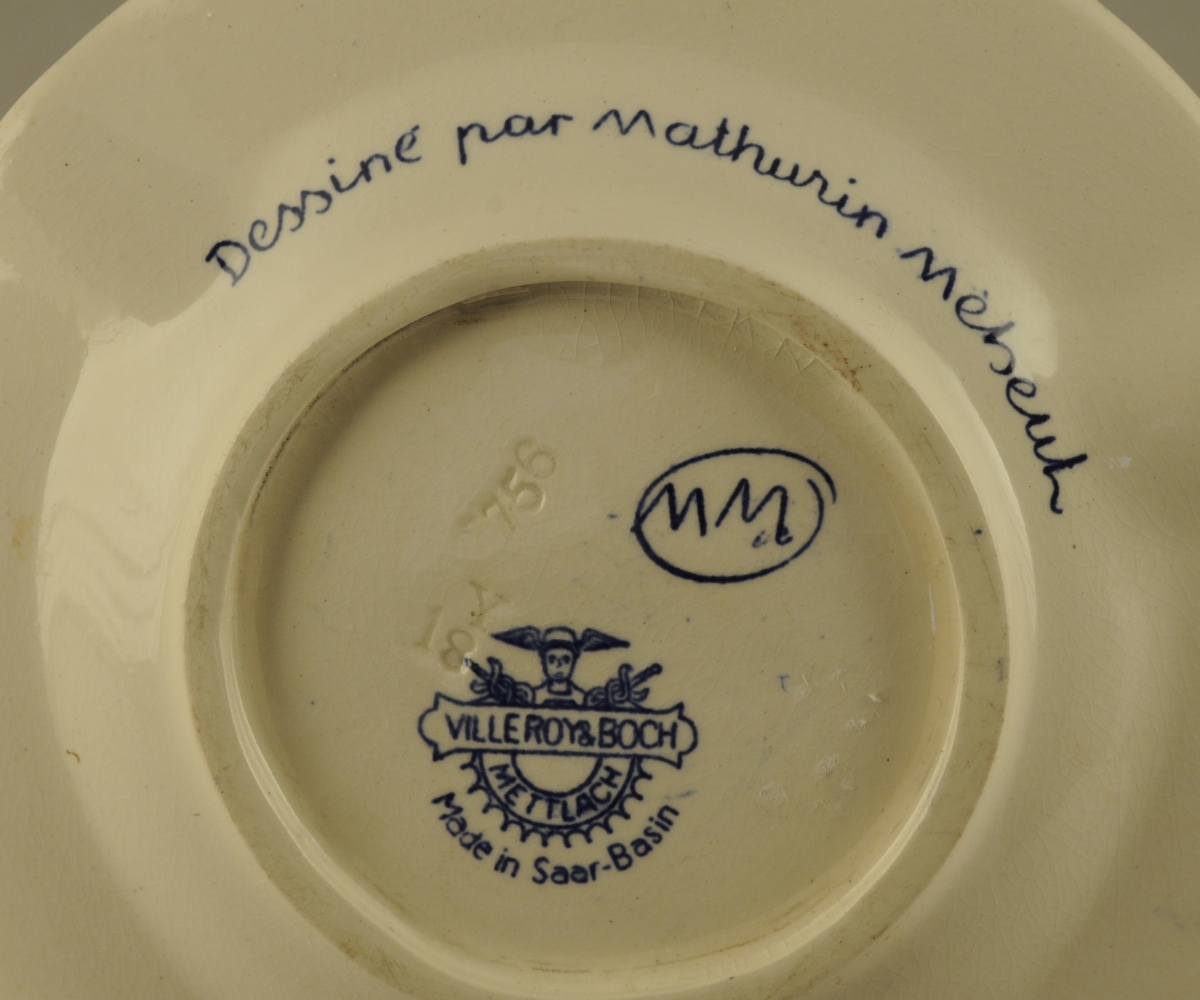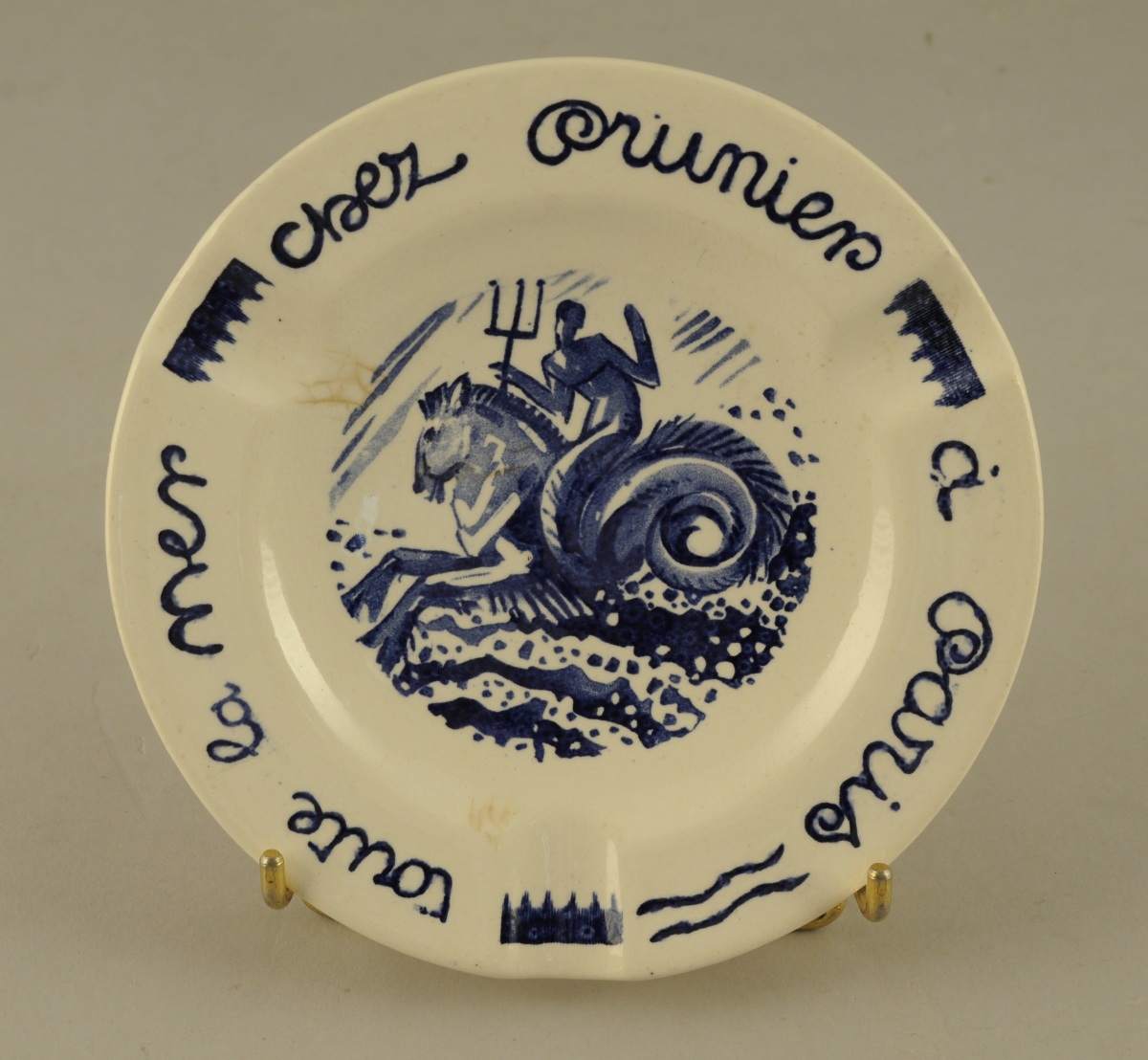 Mathurin MÉHEUT (1882-1958) pour VILLEROY et BOCH. Cendrier de la Maison Prunier en faïence émaillée bleu. Décor dans le bassin du dieu Neptune chevauchant un cheval marin. Marque "Chez Prunier à Paris. Toute la mer". Signé.