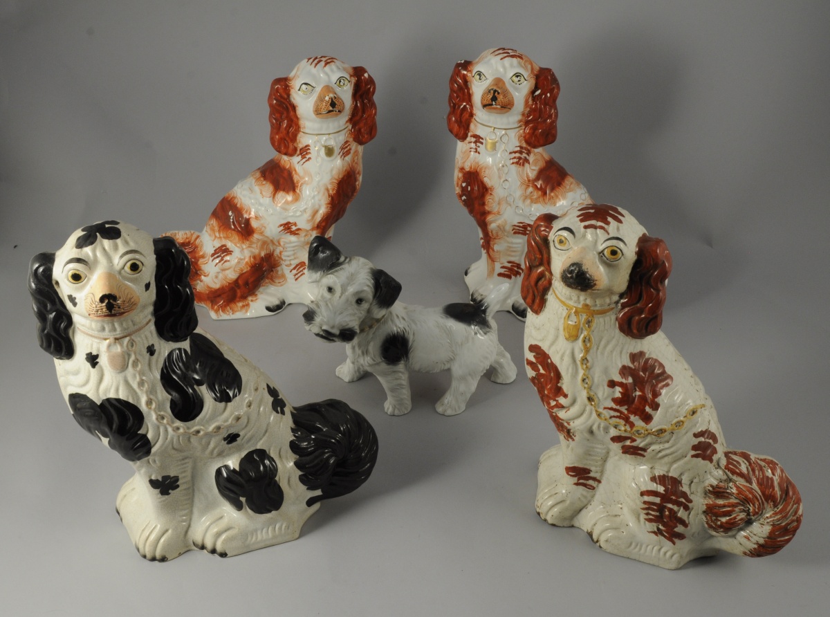 - STAFFORDSHIRE. DEUX ÉPAGNEULS en faïence fine. XIXème. Haut. 32, Larg. 26, Prof. 10 cm. (fêle, accidents, restaurations)