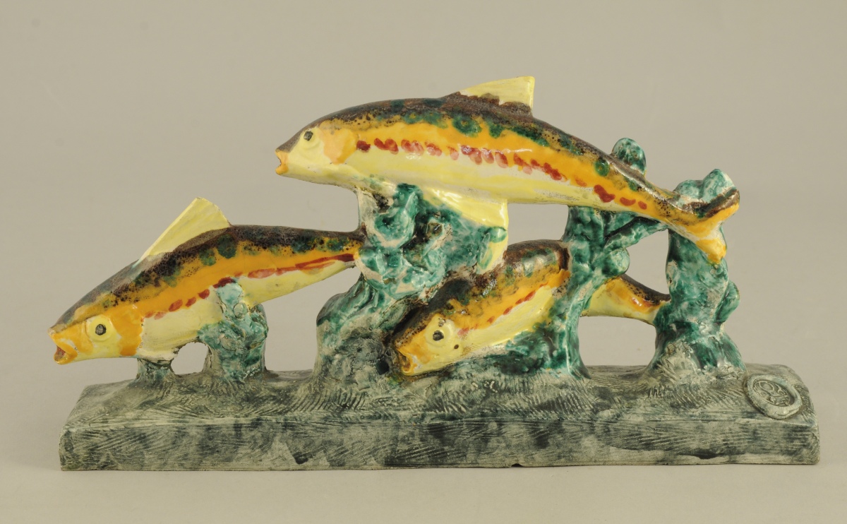 DANEMARK? SCULPTURE en faïence polychrome figurant trois truites nageant à travers des algues. Cachet de manufacture inconnu.