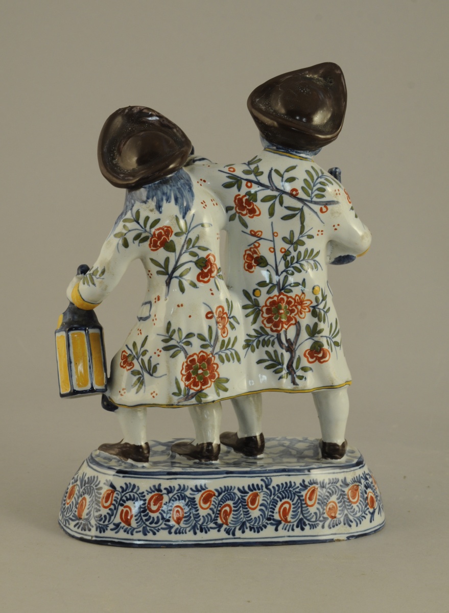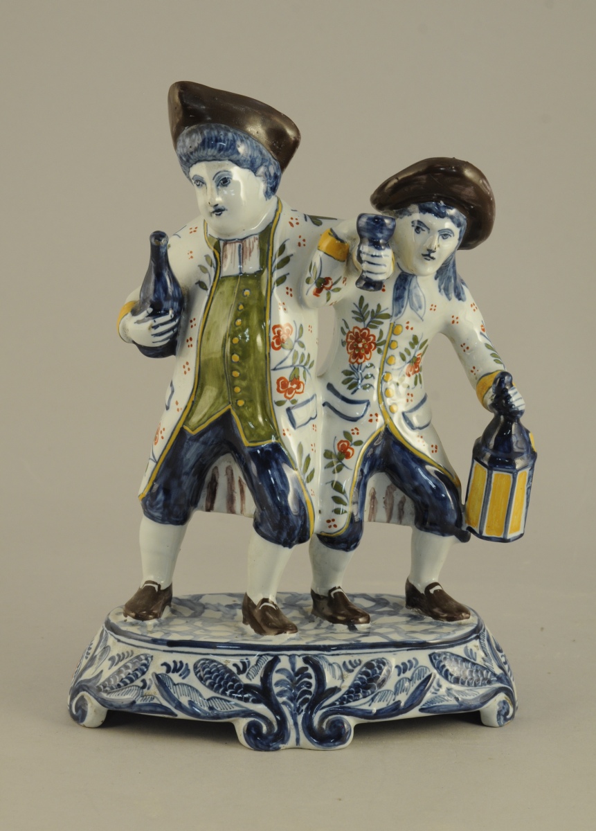 DELFT? Le veilleur de nuit et l'ivrogne. Groupe en faïence de grand feu sur un socle oval. Fin XIXème.