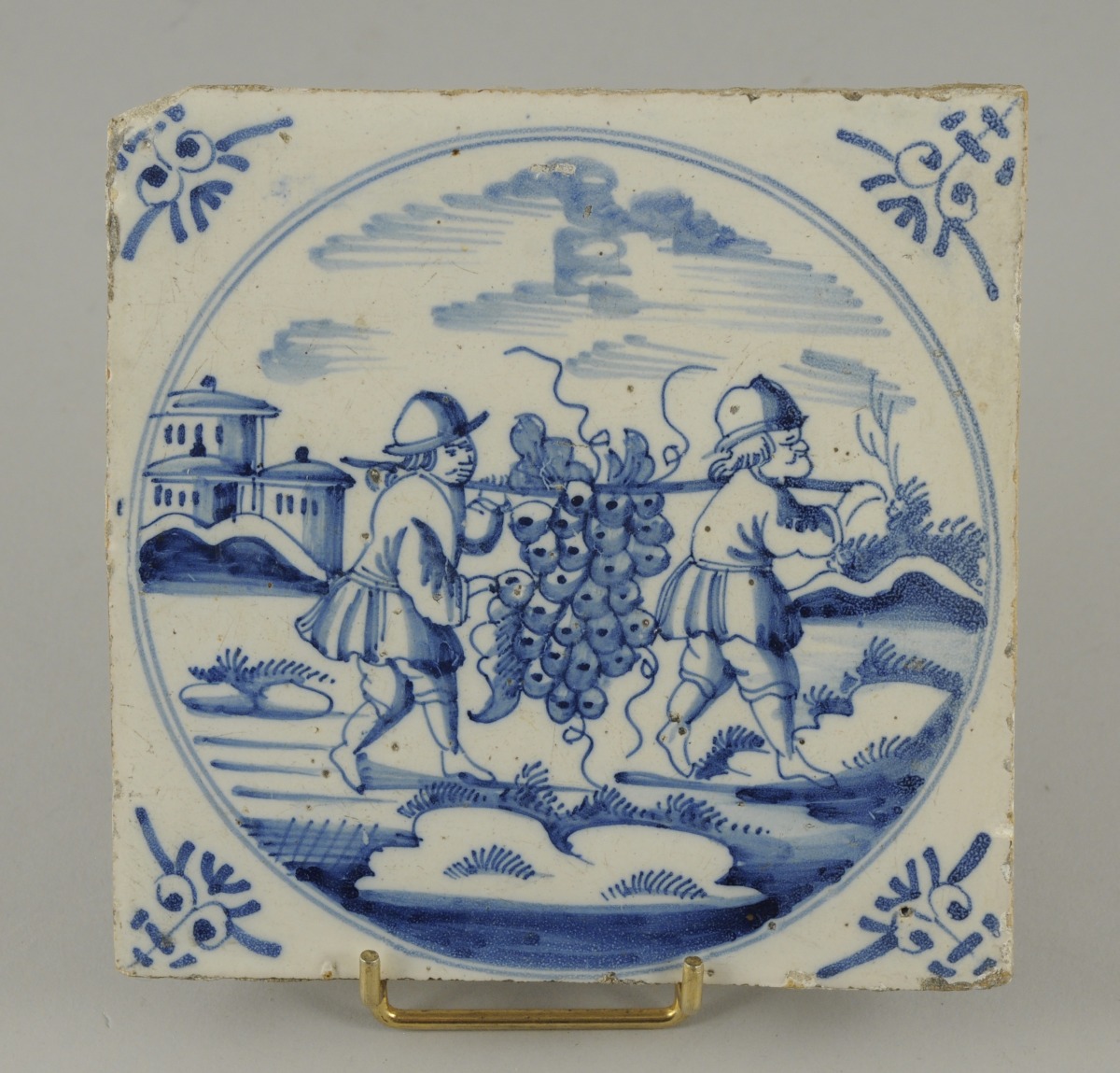 DELFT. CARREAU de forme carrée en faïence stannifère à décor en camaïeu de bleu figurant deux vignerons transportant une grappe de raisin géante.