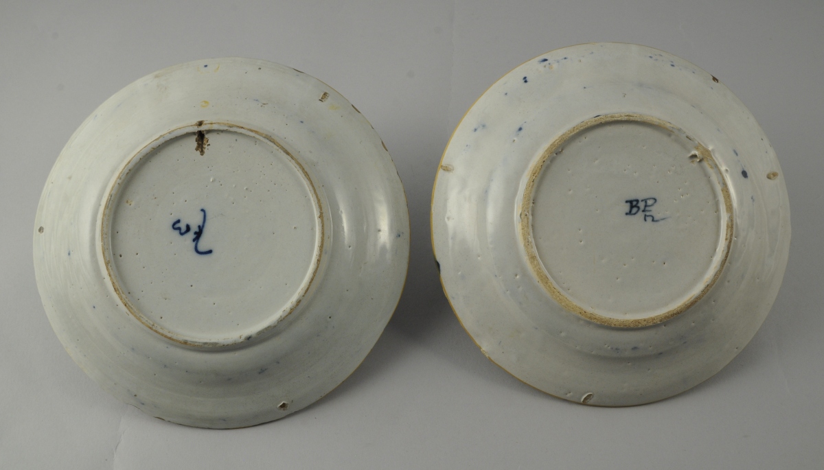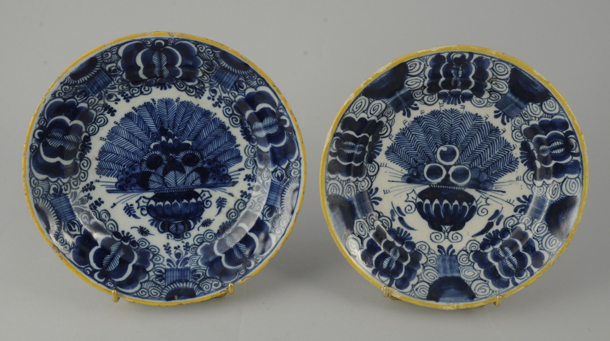 DELFT. DEUX ASSIETTES creuses en faïence à décor camaïeu bleu sur fond blanc d'un vase fleuri. Filet jaune sur le bord. Marques en bleu sous couverte "BP 12" et "3".