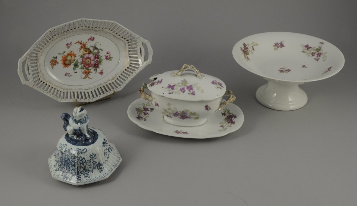 -COUPE à fruits et SAUCIÈRE en faïence fine, à décor de semis de fleurs.