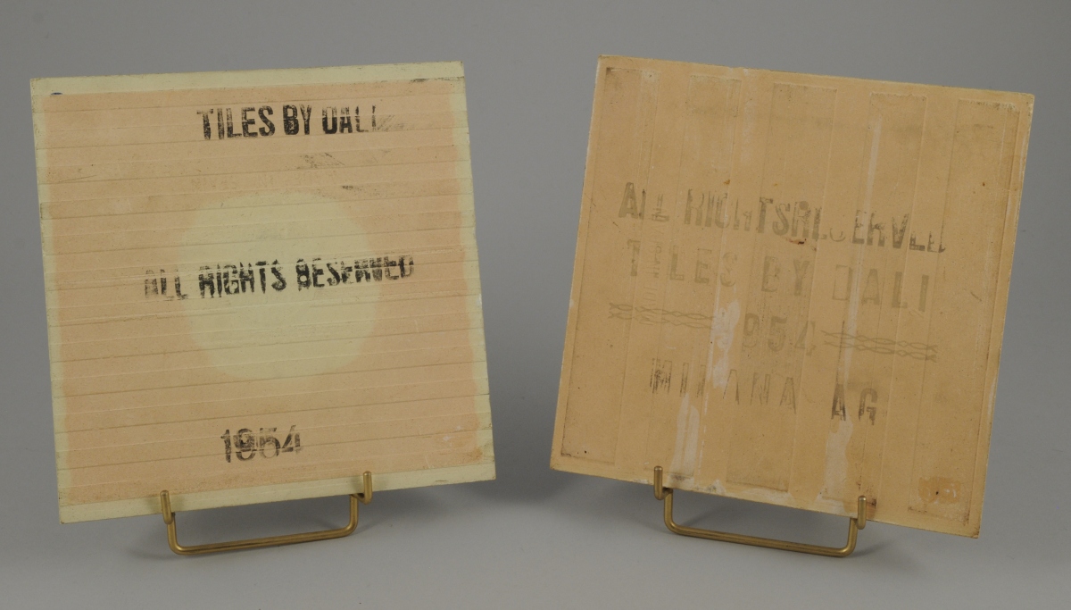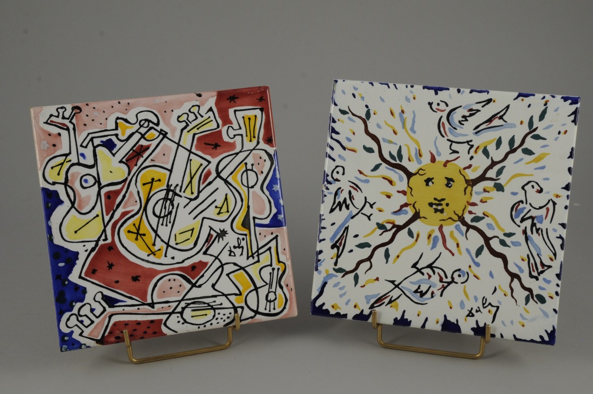 Salvador DALI (1904-1989), d'après. Deux carreaux en céramique émaillée réalisés en Espagne par Maurice Duchin en 1954. L'un présente un soleil stylisé et l'autre des instruments à cordes.