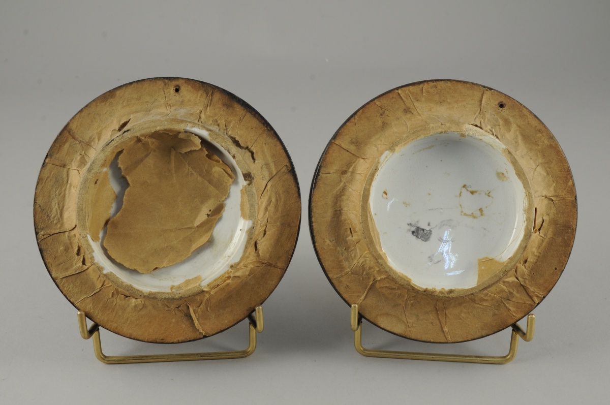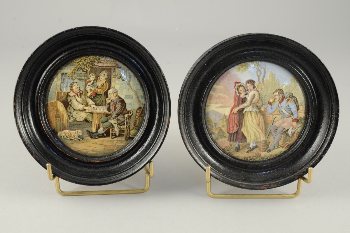 PAIRE de MÉDAILLONS en faïence à décor imprimé polychrome représentant des joueurs de dames et deux jeunes femmes offrant de l'eau à un soldat. Cadres en bois noirci.