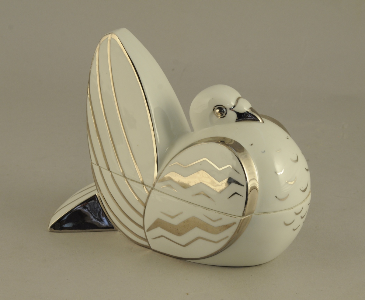 LIMOGES. BONBONNIÈRE en forme de pigeon en porcelaine blanche. Rehauts argent pour les yeux, le bec et le plumage. Marque au tampon "LIMOGES ULIM FRANCE", marque de l'Union Limousine déposée de 1950 à 1958.