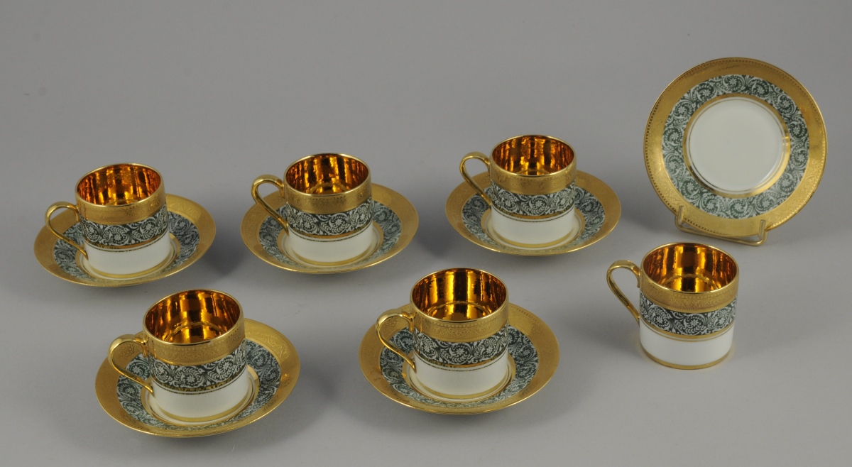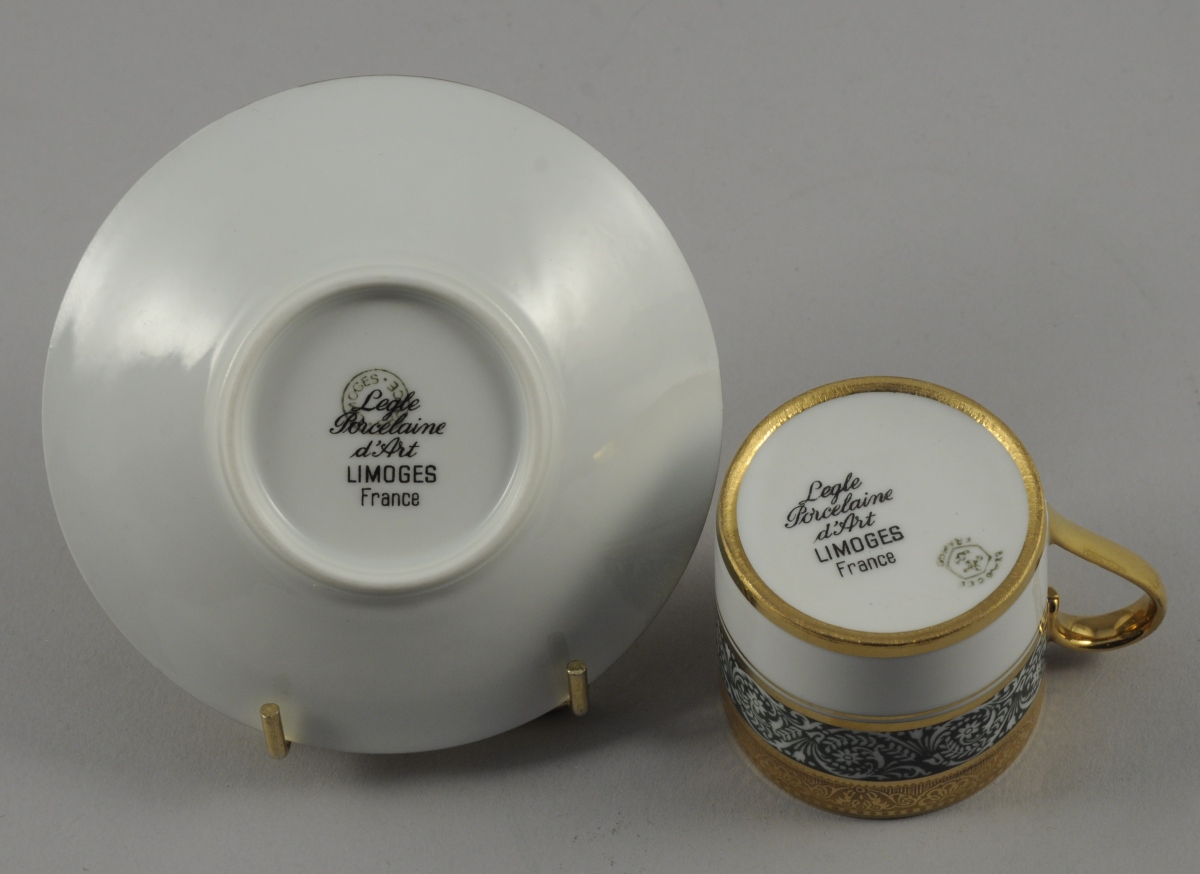 LIMOGES. SUITE DE SIX TASSES à café de forme litron et leurs sous-tasses en porcelaine à fond blanc. Décor de frises de perles, lambrequins, dents de loup et filets or et d'une frise de rinceaux verts et blancs. Marque au tampon à la fleur de lys "LIMOGES FRANCE" ; "marquées "Legle Porcelaine d'Art LIMOGES France".