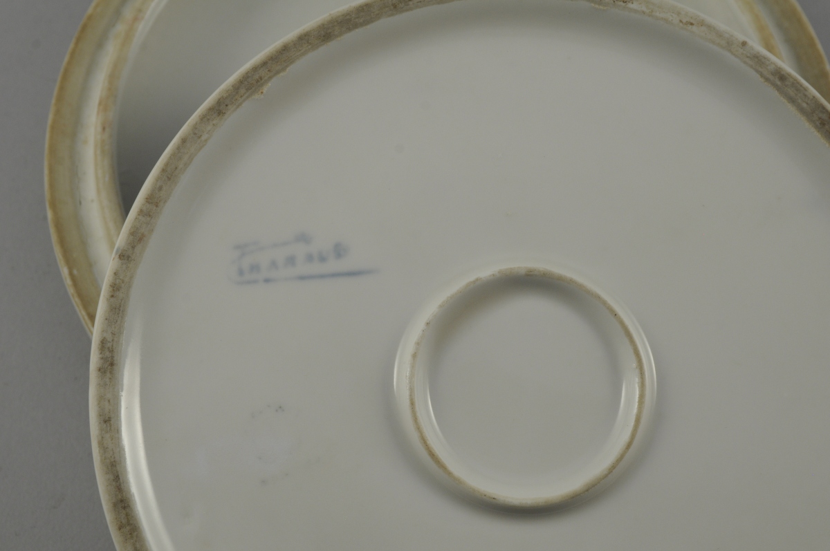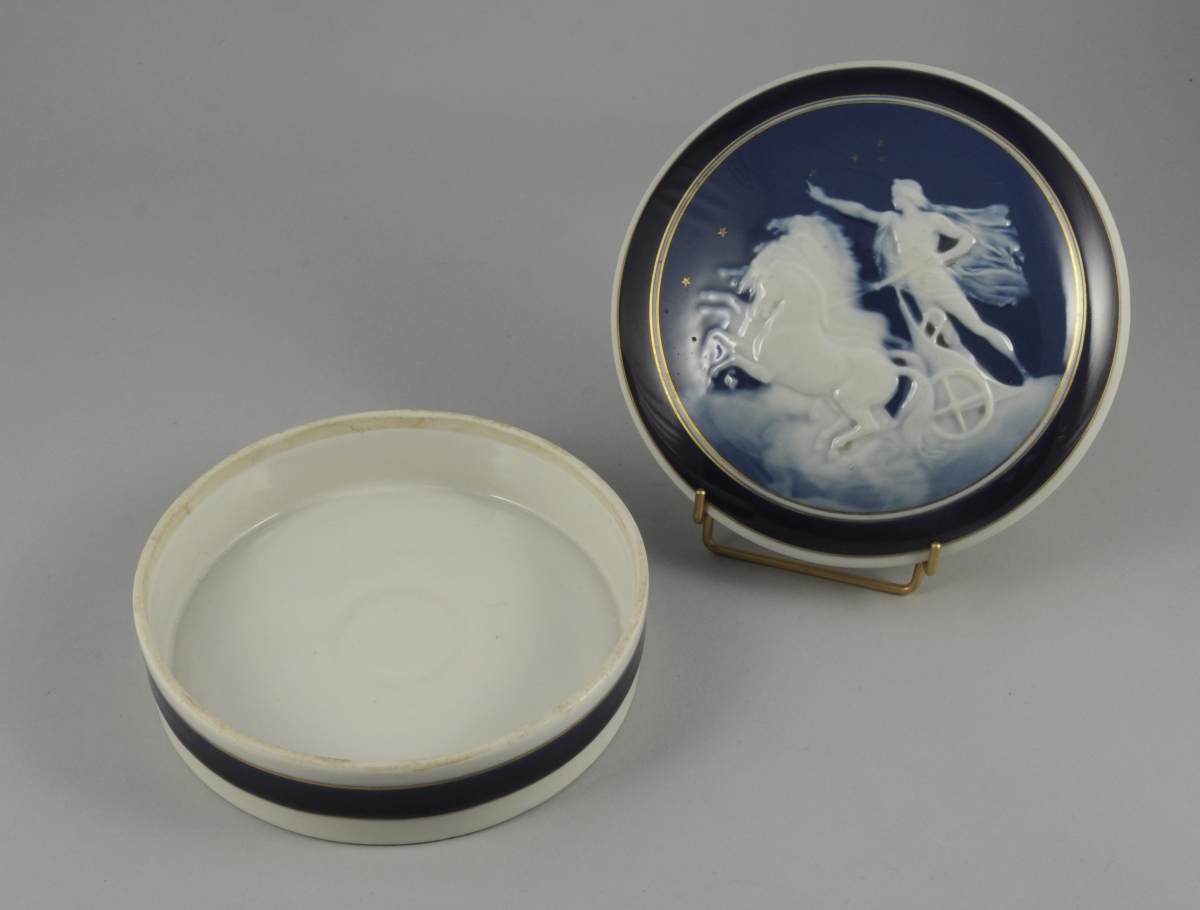 LIMOGES. THARAUD. BONBONNIÈRE circulaire en porcelaine pâte sur pâte à fond bleu. Décor en blanc du Char d'Apollon tiré par quatre chevaux. Filets or sur le bord. Décor signé CT Limoges. Marque en bleu au revers C Tharaud et trace de marque de Limoges.