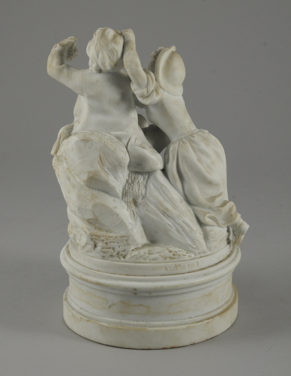 NIDERVILLER. GROUPE en BISCUIT représentant deux enfants se disputant une grappe de raisin. Socle circulaire mouluré. Marqué "NIDERVILLER N°102" sur le socle.