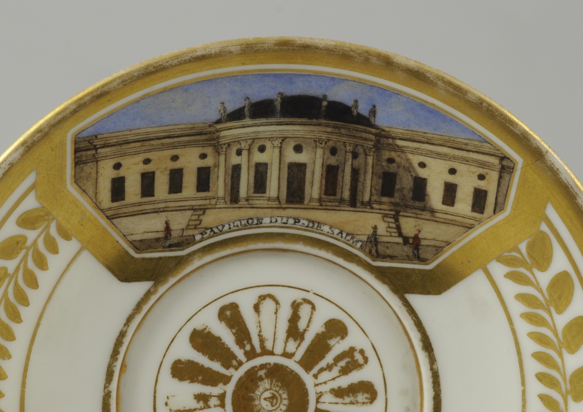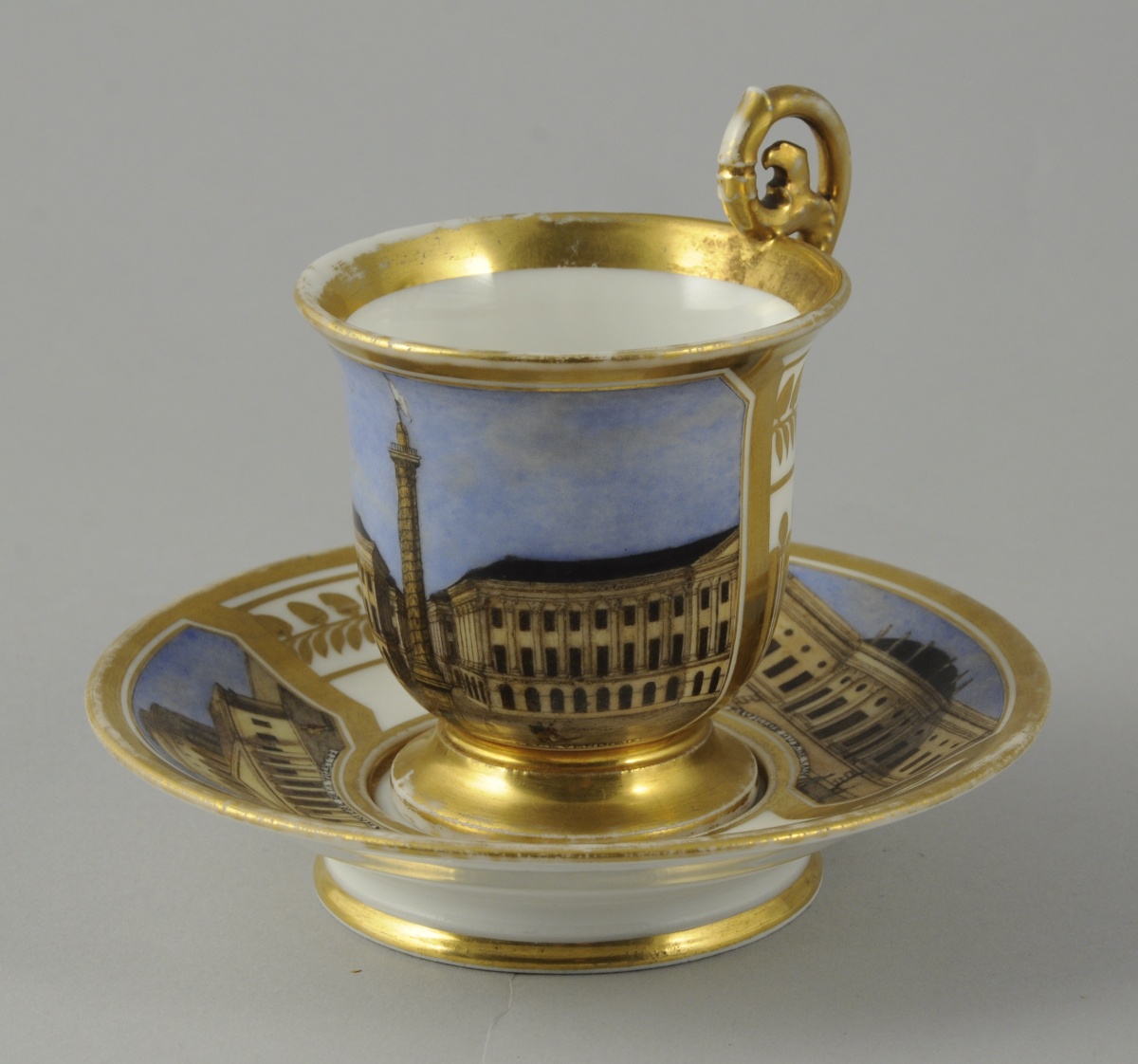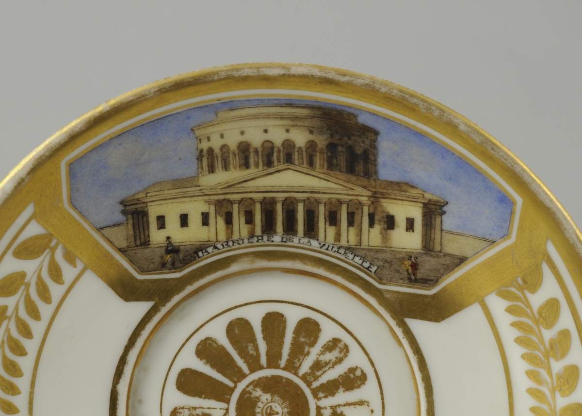 TASSE et SOUS-TASSE en porcelaine. Décor polychrome et or de trois vues topographiques de Paris légendées "Vue de la colonne Place Vendôme", "Barrière de la Villette" et "Pavillon du Prince de Salm". Anse adoptant la forme d'un rinceau.