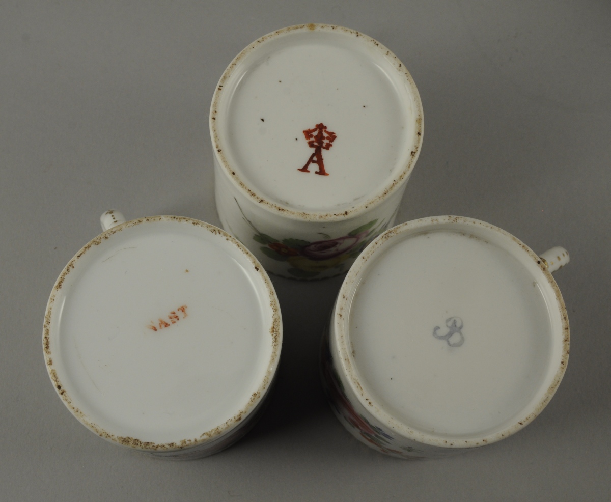 - QUATRE TASSES. Décor polychrome de jetés de fleurs et rangs de perles or sur les bords. L'une marquée "NAST" (actif rue Popincourt à Paris entre 1785 et 1835) et deux autres au "A "couronné. Haut. 6,5, Diam. 6,5 cm. (fêles)