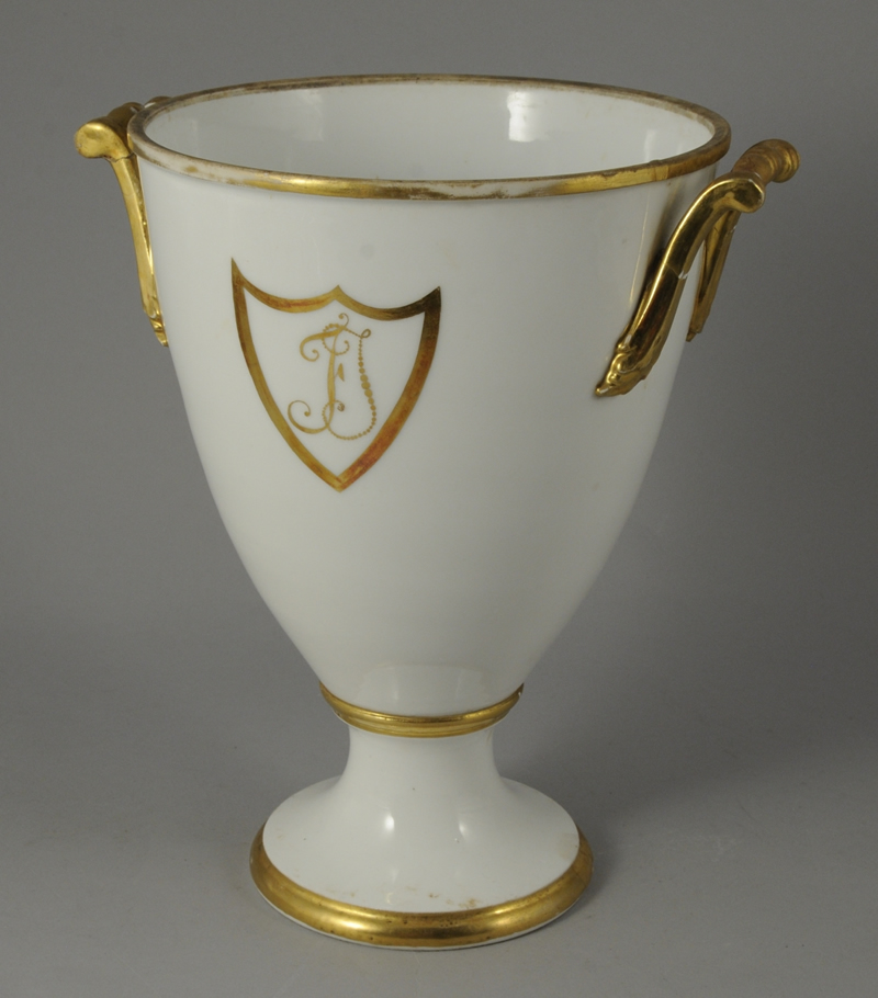 - VASE calice à fond blanc rehaussé or. Monogrammé sur les deux faces "FI" dans une réserve en forme d'écu. Haut. 26,6, Diam. 19 cm. (manque et restaurations aux anses)