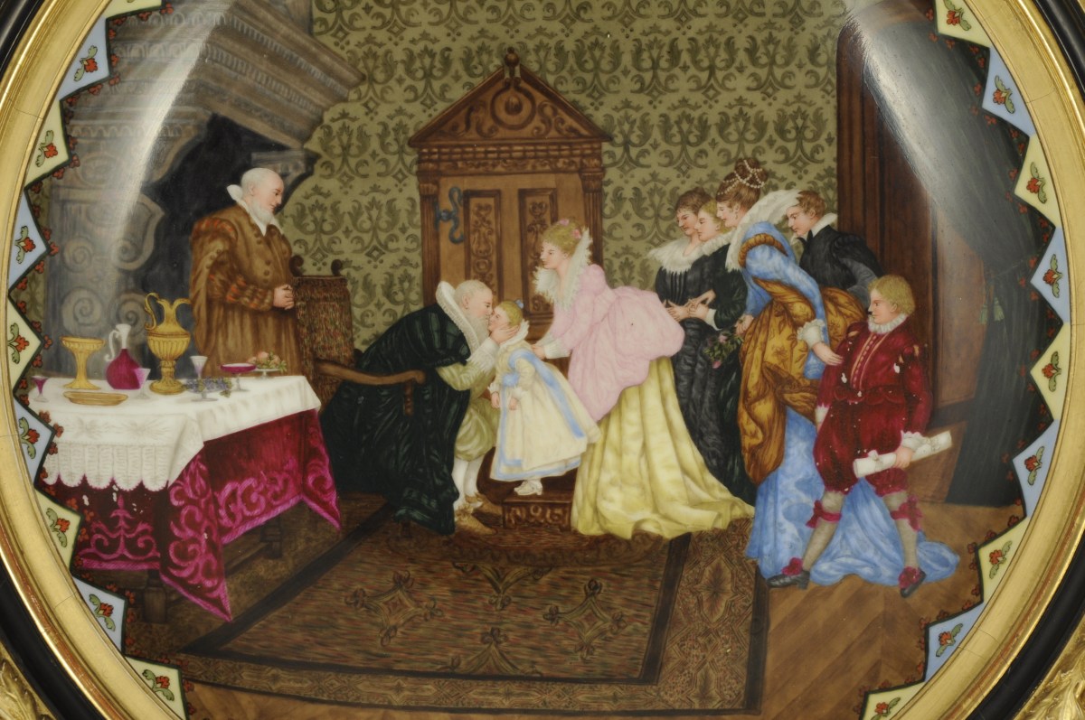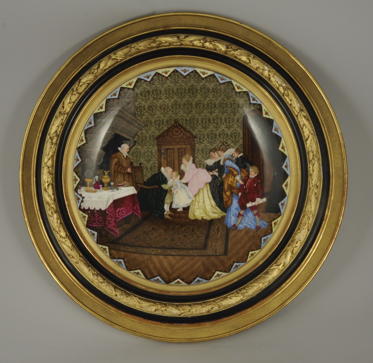 PARIS. PRÉSENTATION DU DAUPHIN À HENRI IV. Grand PLAT circulaire à décor émaillé peint. Style troubadour.