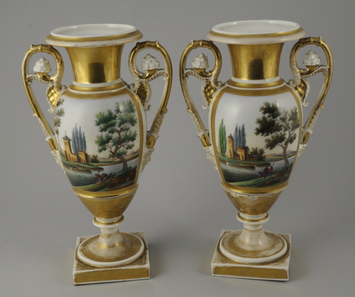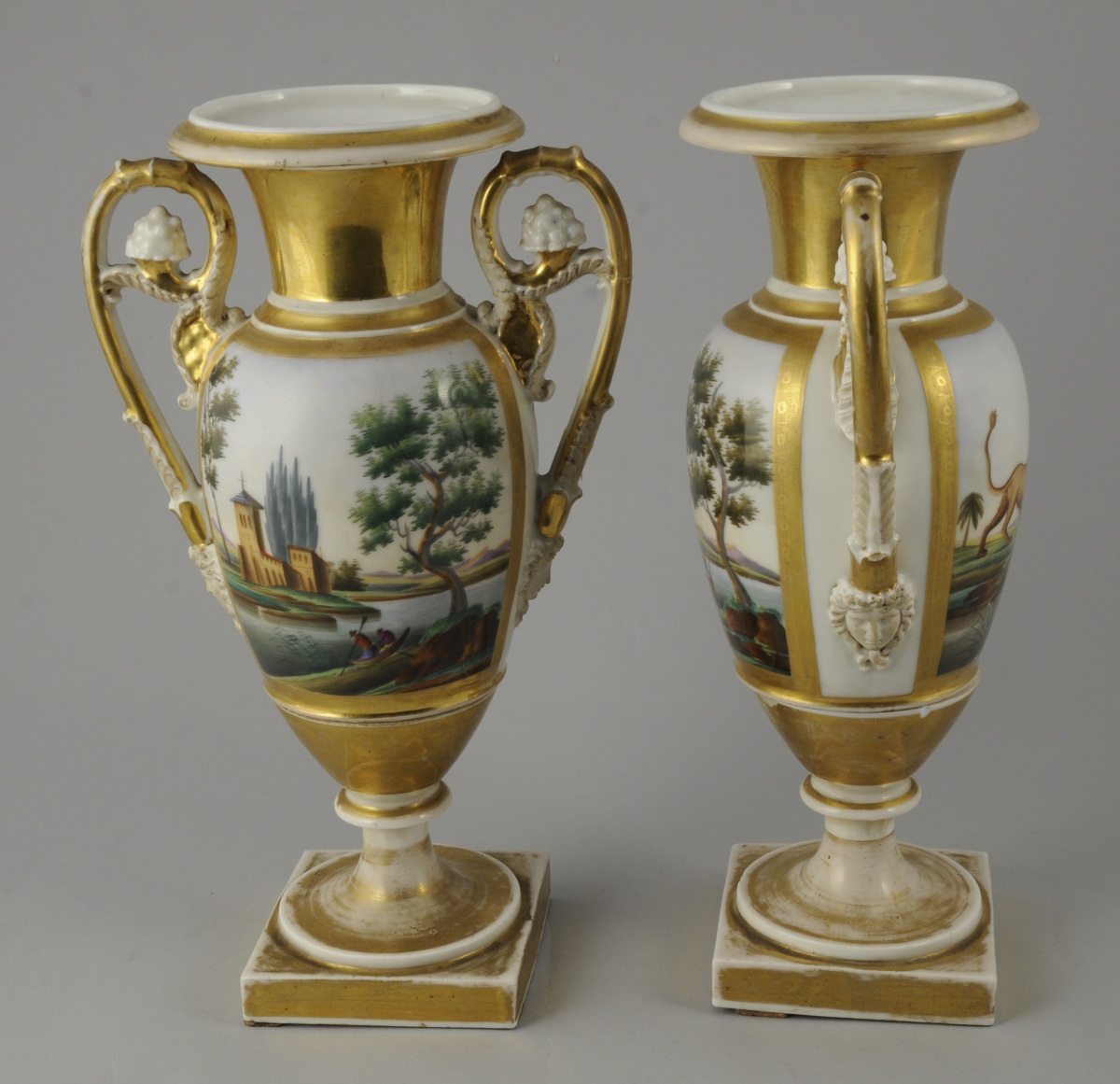 PARIS. Paire de VASES BALLUSTRES AUX FABLES DE LA FONTAINE en porcelaine à décors peints de scènes des fables de La Fontaine dans un entourage à l'or deux tons. L'un représente le "Lion et le renard", l'autre le "Chien et le loup". Grandes scènes lacustres peintes au dos des vases. Les anses à enroulement feuillagés, feuille d'acanthe, mascarons en biscuit et pampres. Deux parties montées autour d'une tige métallique.